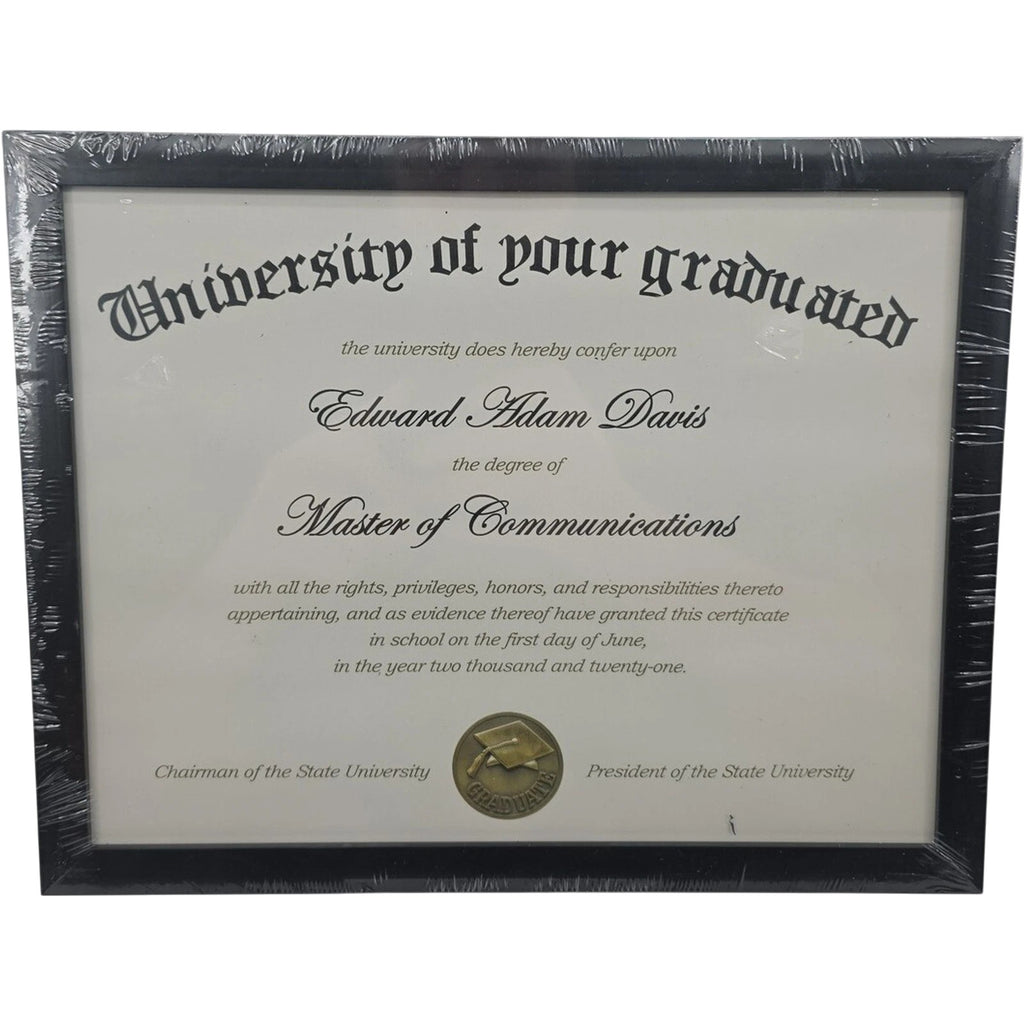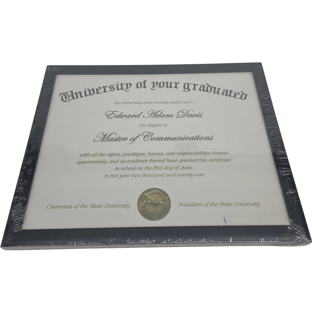 This 12x9.5 Certificate Frame in black is the perfect display holder for diplomas, certificates, or awards. The solid color design with a rectangular shape makes it a sleek and classic addition to any home décor. With dimensions of 12x8.5 inches and a height of .5 inches, this frame is ideal for showcasing important documents in style. Whether it's for a graduation or just to keep important papers safe, this certificate frame is a practical and stylish choice.