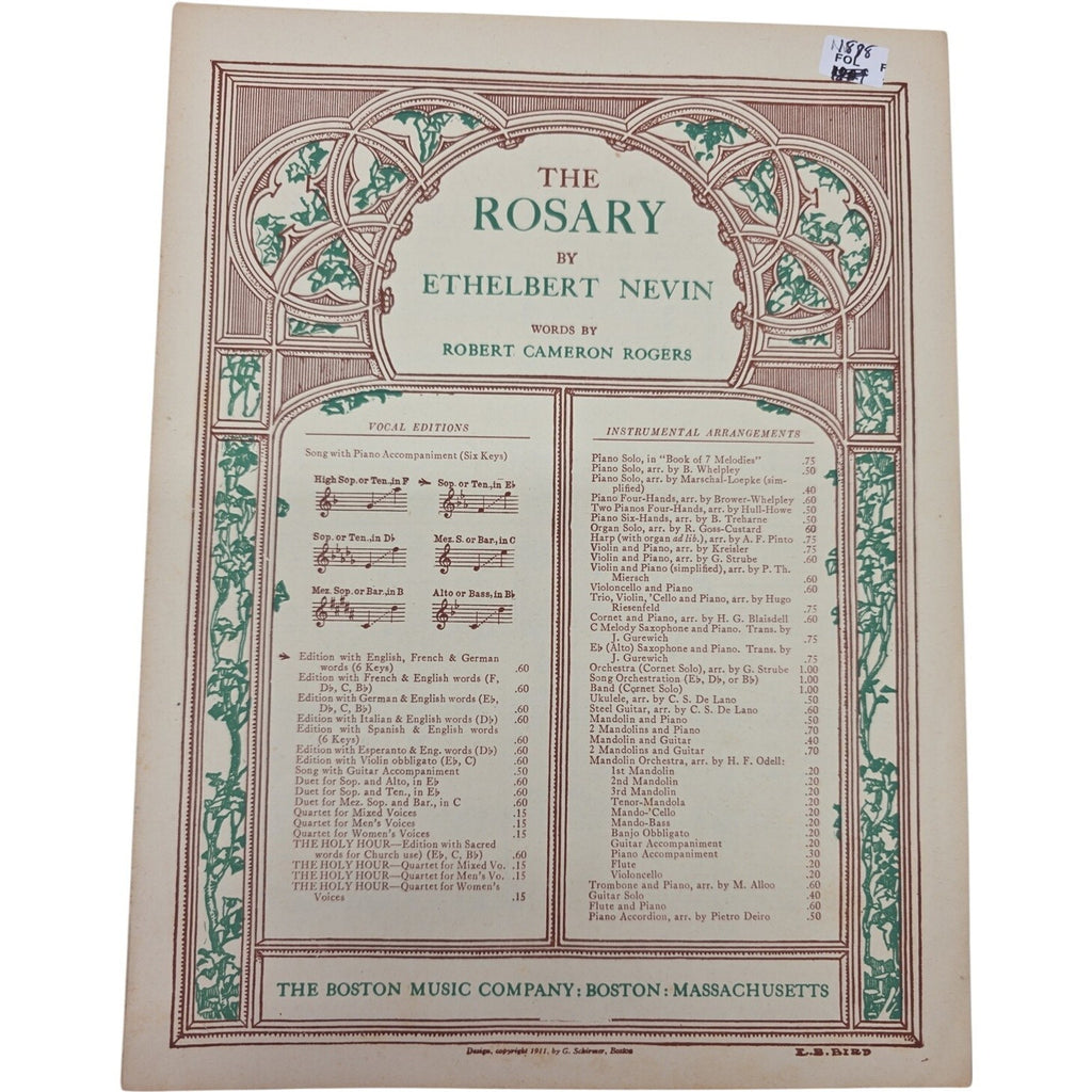 The product is a vintage 1905 Art Nouveau cover for sheet music titled "The Rosary" by Ethelbert Nevin. This sheet music is specifically for piano and falls under the genre of religious and devotional music. It was published by The Boston Music Company in the United States and includes one unit of sheet music. The cover design reflects the Art Nouveau style popular at the turn of the 20th century, adding a unique and nostalgic touch to this musical piece.