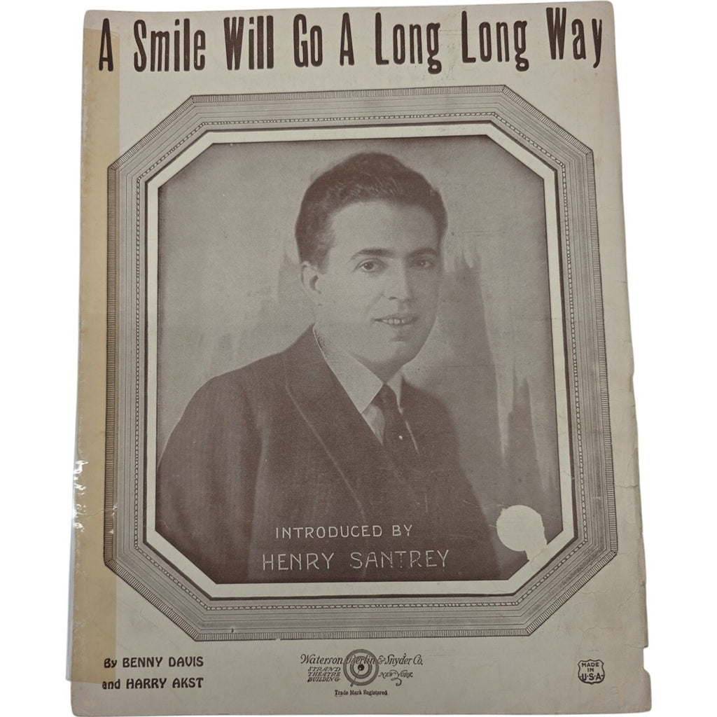 The product is a vintage sheet music featuring the song "A Smile Will Go a Long Long Way" sung by Henry Santrey, published by Waterson, Berlin & Snyder Co in the United States. This one-unit sheet music is a nostalgic piece of musical history that captures a bygone era of music and performance. Perfect for collectors or musicians looking to add a unique and charming piece to their collection or repertoire.