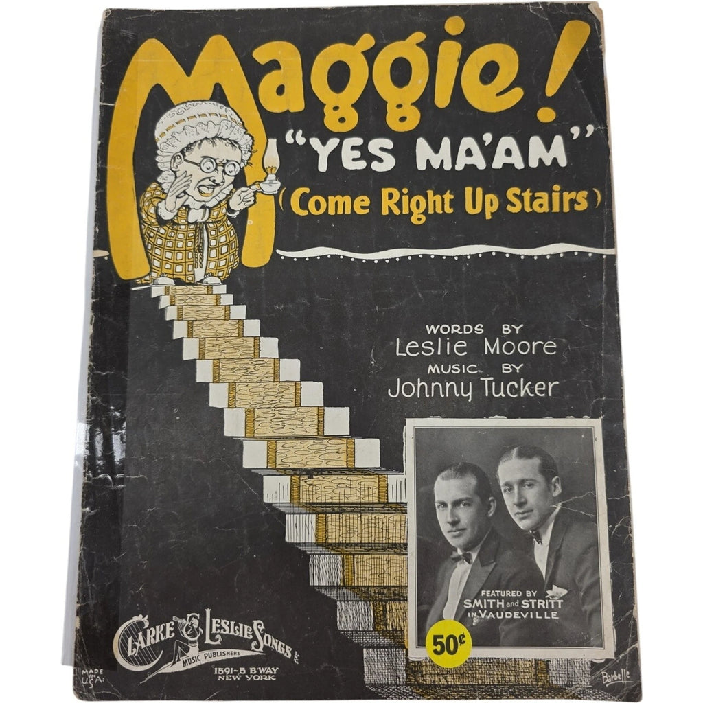 The product is a vintage sheet music titled "Maggie Yes Ma'am Come Right Up Stairs" by Leslie Moore, published by Clarke & Leslie Songs, Inc in the United States. This sheet music falls under the genre of Musicals and is presented in the format of a single unit. It offers collectors and enthusiasts a glimpse into musical history with a piece of sheet music from 1923, showcasing a unique and nostalgic composition from that era.