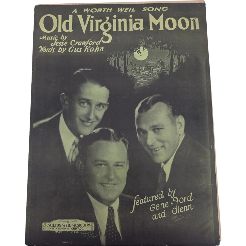 The product is a vintage sheet music titled "1924 Old Virginia Moon" by Jesse Crawford, Gus Kahn, and Milton Weil. Published by Milton Weil Music Co., this sheet music is suitable for mixed instruments and consists of one unit. Perfect for collectors of vintage and antique sheet music, this item offers a glimpse into the musical compositions of the past and provides a unique addition to any music enthusiast's collection.