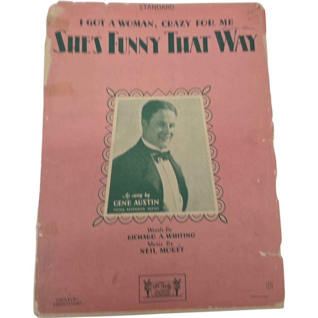The product is vintage sheet music for the song "1928 She's Funny That Way" as sung by Gene Austin. This sheet music is in format and belongs to the Jazz genre. It was manufactured in the United States and is a unique unit quantity of 1. The Orchestra ensemble would be required to play this piece of nostalgia from the past, making it a coveted item for collectors and music enthusiasts alike.