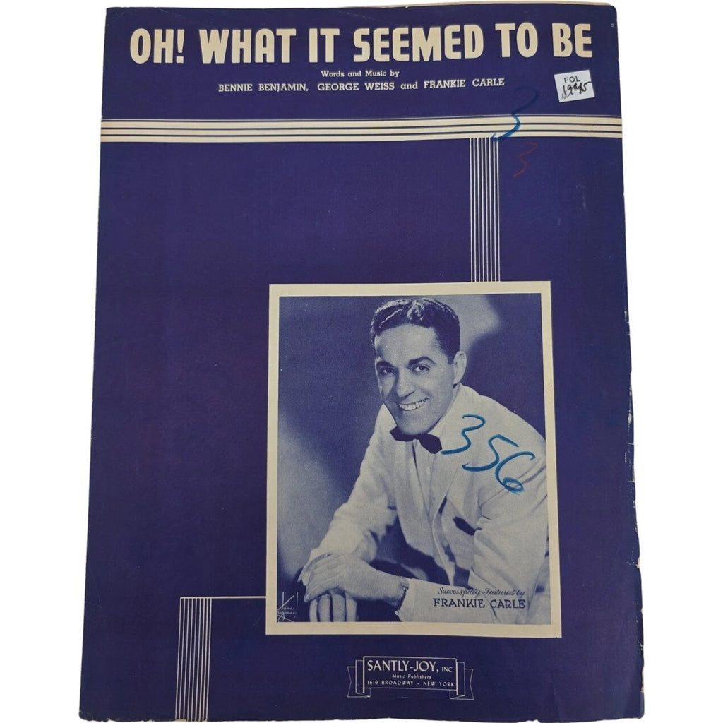 The product is a vintage sheet music titled "1945 Oh What It Seemed to Be" by Frankie Carle. Published by Santly-Joy Inc. in the United States, this intermediate level sheet music is suitable for piano, vocal, and guitar. The pop and musical genre of the song makes it a versatile choice for musicians looking to play classic tunes from the mid-20th century. Perfect for collectors or musical enthusiasts, this sheet music allows for the nostalgic experience of playing timeless songs from the past.