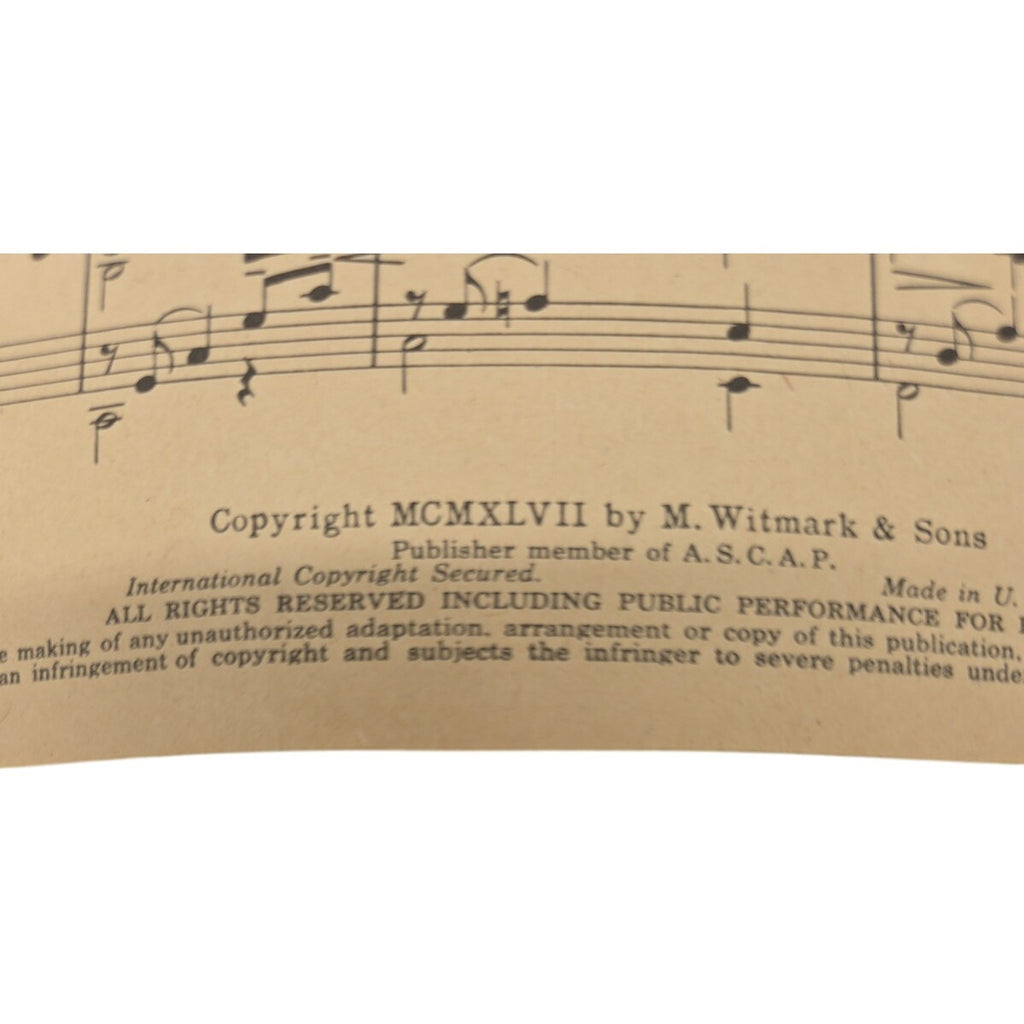 The product is a vintage sheet of music from the Warner Bros movie "At the Candlelight Café" featuring Tisa Lilli and Palmer. This memorabilia item represents a piece of entertainment history from the United States movie industry, specifically tying to a romantic musical film produced by Warner Bros in 1949. The sheet music captures the essence of the movie's songs and themes, making it a unique and nostalgic collectible for fans of classic Hollywood cinema.