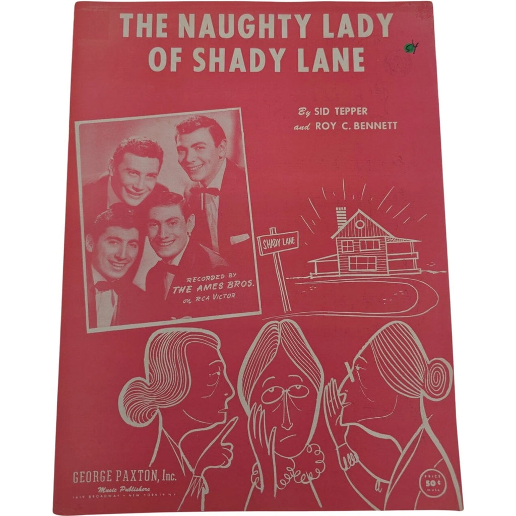 The 1954 "The Naughty Lady of Shady Lane" sheet music, recorded by The Ames Bros, features lyrics and music by Sid Tepper and Roy C. Bennett. Published by George Paxton Inc. in the United States, this vintage sheet music is in format and suitable for playing on piano and ukulele. The cover showcases The Ames Brothers, adding to the charm and nostalgia of this 1950s era piece of musical history. Perfect for collectors or musicians looking to add a piece of classic music to their repertoire.