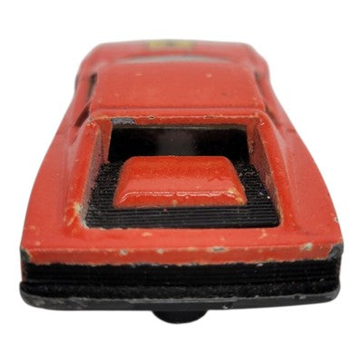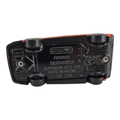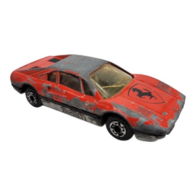 The product is a vintage 1986 Matchbox Red Ferrari Testarossa and a 1981 Matchbox Ferrari 308 GTB. These diecast toy vehicles are part of the Matchbox Superfast series and are in 1:64 scale. The vehicles are iconic Ferrari models in blue color and are highly collectible for toy and vintage car enthusiasts. The Ferrari 308 GTB is in very rough shape with a broken window and bad paint as shown.