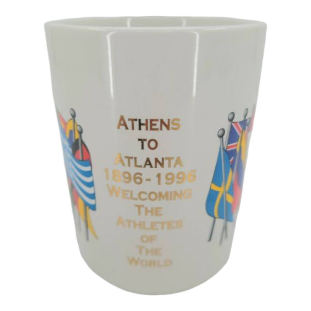 Celebrate the historic 1996 Olympic Games in Atlanta with this rare 14oz coffee cup commemorating the 100th anniversary of the Olympics. This vintage coffee cup is in pre-owned, never-used condition, as it was a display item. It has been carefully preserved and remains free from cracks, chips, scratches, or stains, making it a true collectible for Olympic fans and history enthusiasts alike.