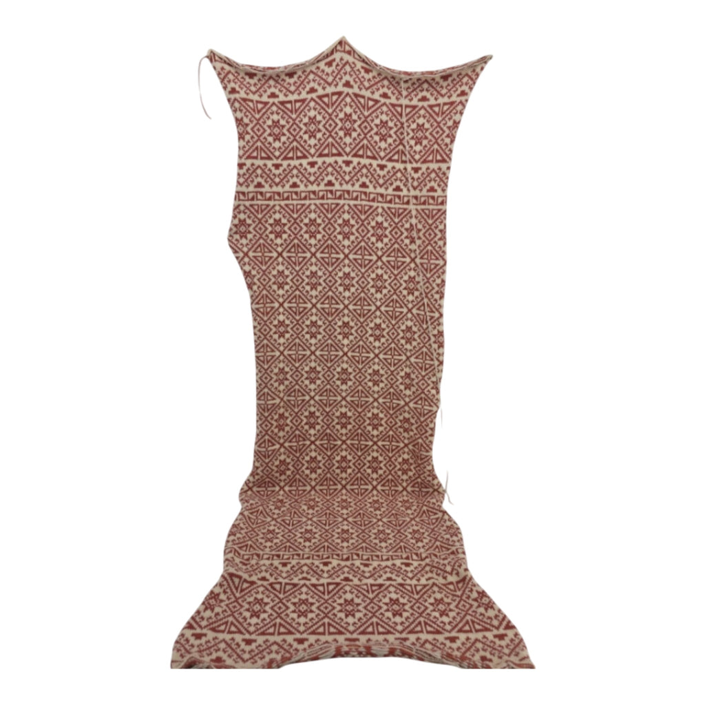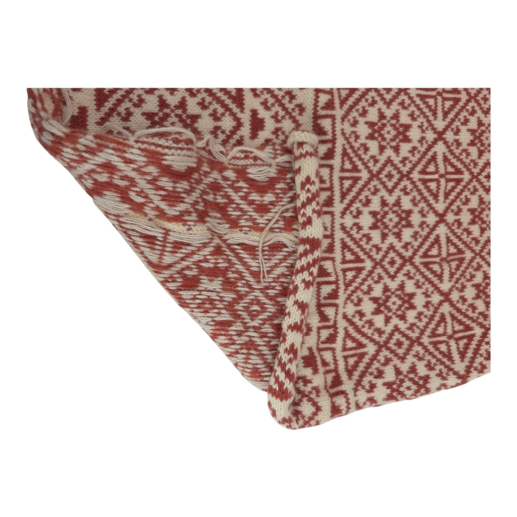 The product is a hand-knit, unfinished crochet knitting project measuring 57 inches in length and 23.5 inches in width. The project features a vibrant red and white color scheme, showcasing a traditional Nordic design. This unique and spacious project is perfect for those interested in needlecrafts and yarn, providing a creative outlet for crocheting and knitting enthusiasts.