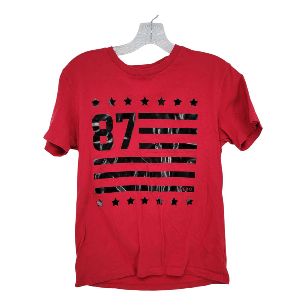 Crafted for comfort and style, this Aero graphic T-shirt is a versatile addition to any wardrobe. Emblazoned with a patriotic flag, stars, and stripes design, it's a bold statement piece for any casual occasion. The soft cotton knit fabric ensures breathability and ease of care, being machine washable for your convenience.