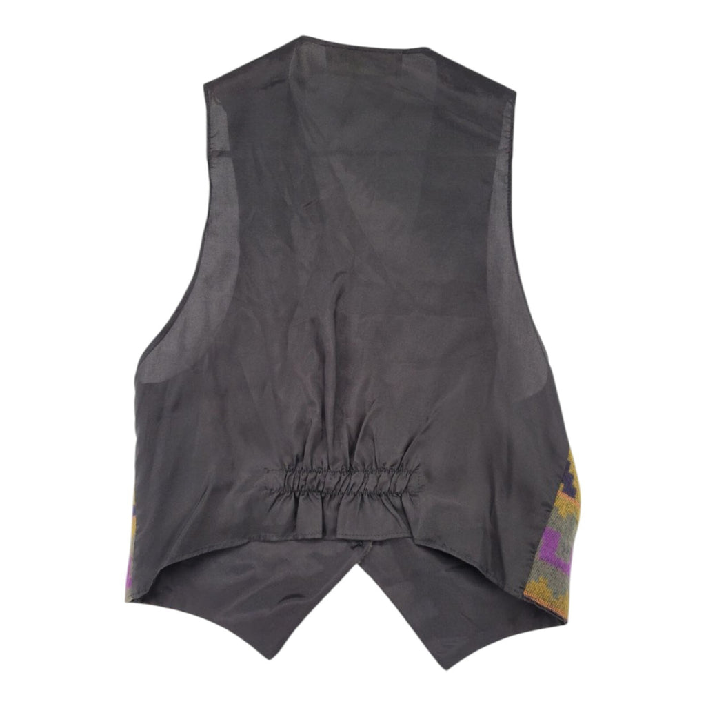 The AJ Maxwell Southwest Aztec Knit Button Vest in Black, Purple, and Gold is a stylish and versatile piece perfect for casual occasions in the fall and winter seasons. Made from polyester knit fabric, this vest features a button closure and is lined for added comfort. The Aztec pattern and multicolor design add a unique touch to the overall look, making it a statement piece in any woman's wardrobe. Machine washable for easy care, this vest from Jason Maxwell is a must-have for those who love bold and fashionable clothing.