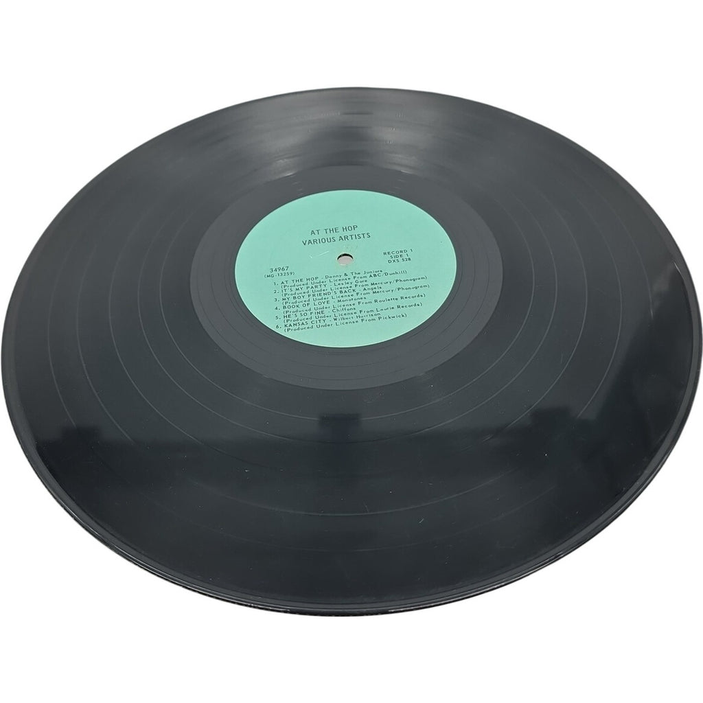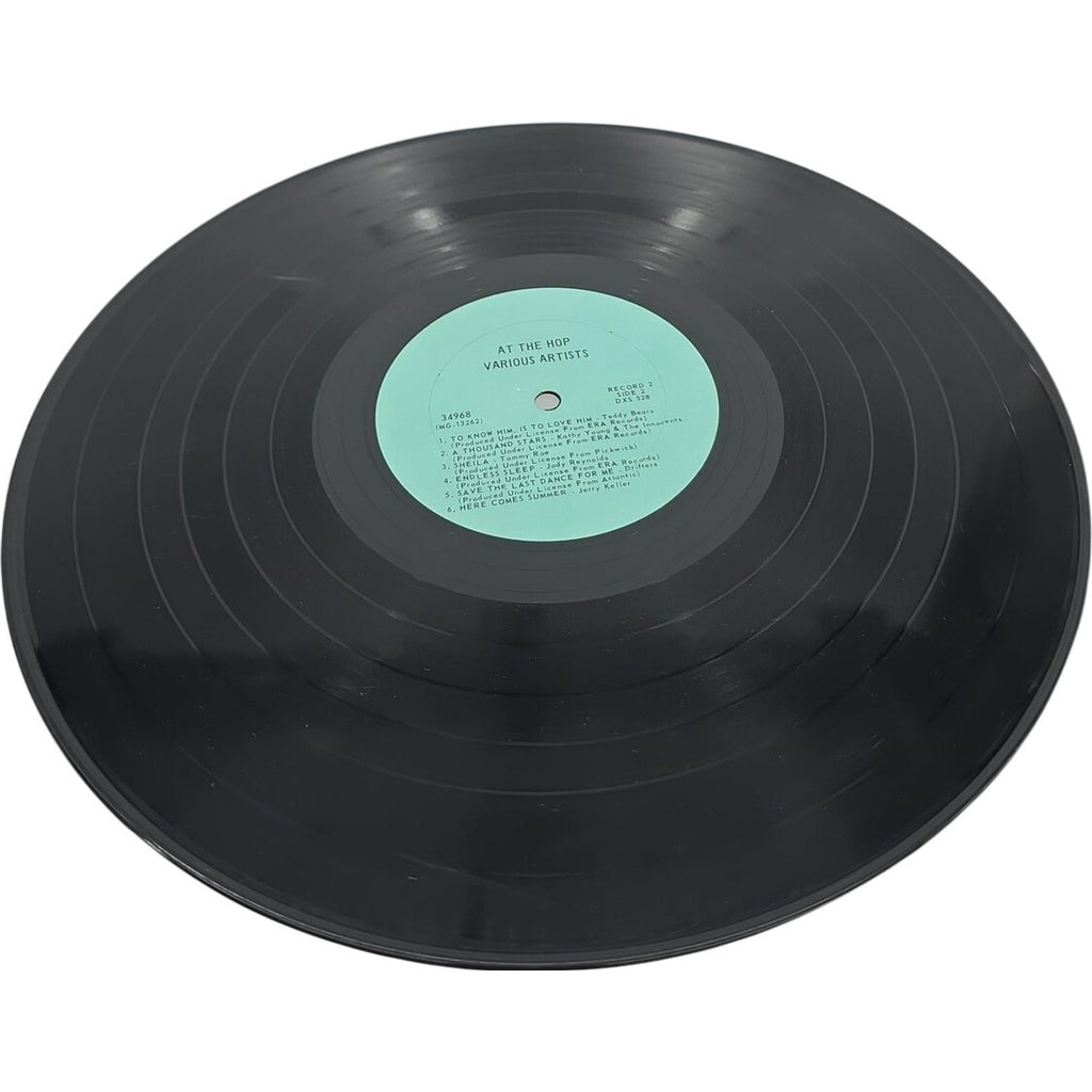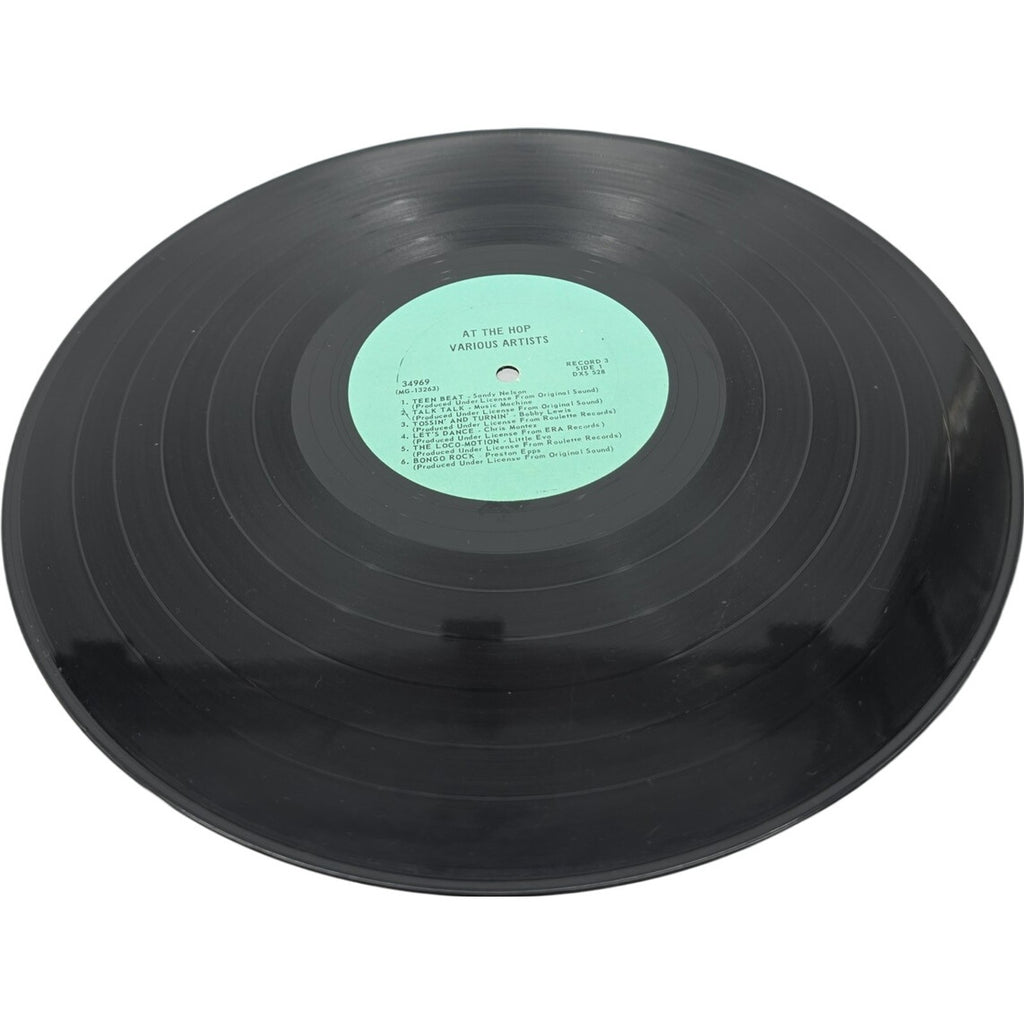 The product is a 3LP vinyl record titled "At The Hop 1975 Various Artist" released by Brookville Records in 1971. This compilation album features artists like The Tokens, The Clovers, The Beach Boys, Buddy Holly, Dion DiMucci, and The Drifters, showcasing a mix of Doo-Wop and Pop Rock styles. The record comes in a cardboard sleeve with original inner sleeve and cover, and is in excellent condition (EX). This first edition triple LP set is a must-have for collectors of rock 'n' roll music from the 1950s, offering a nostalgic trip back to that era with classic hits in stereo.