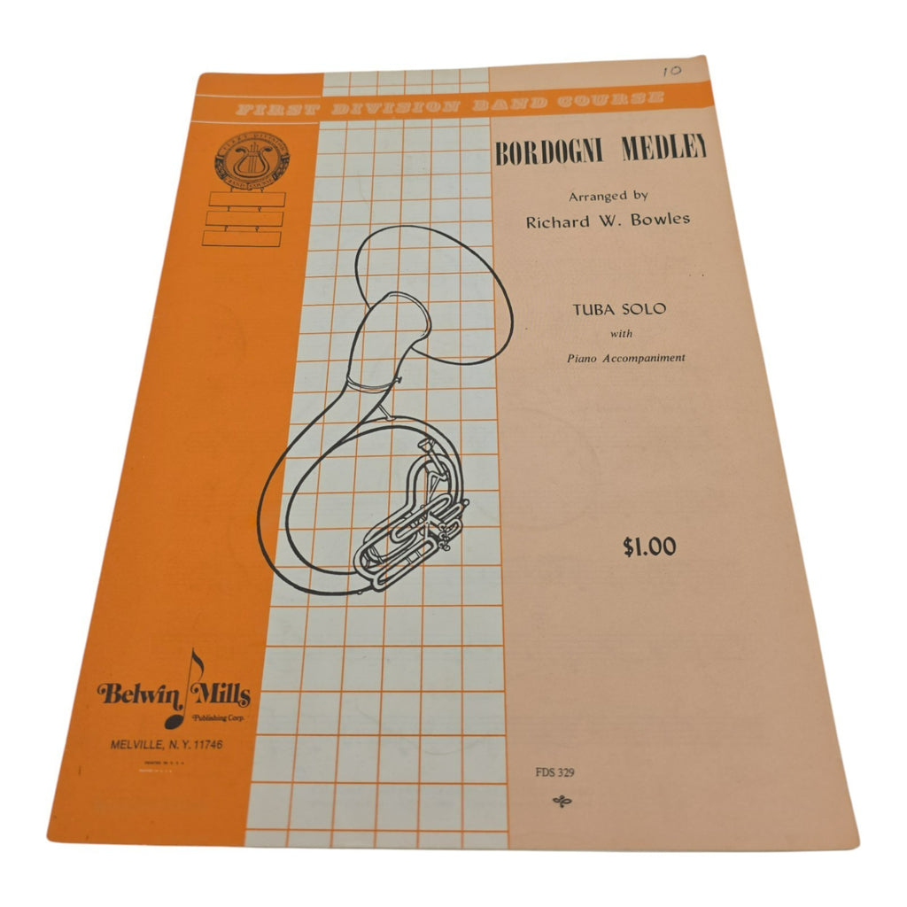 The product is a vintage first edition band course sheet music titled "Bordogni Medley" by Richard W Bowles, published in 1973 in the United States. This sheet music falls under the genre of Musicals and is a single unit. It is a valuable collectible for those interested in musical instruments and gear, specifically sheet music and songbooks from the vintage and antique era.