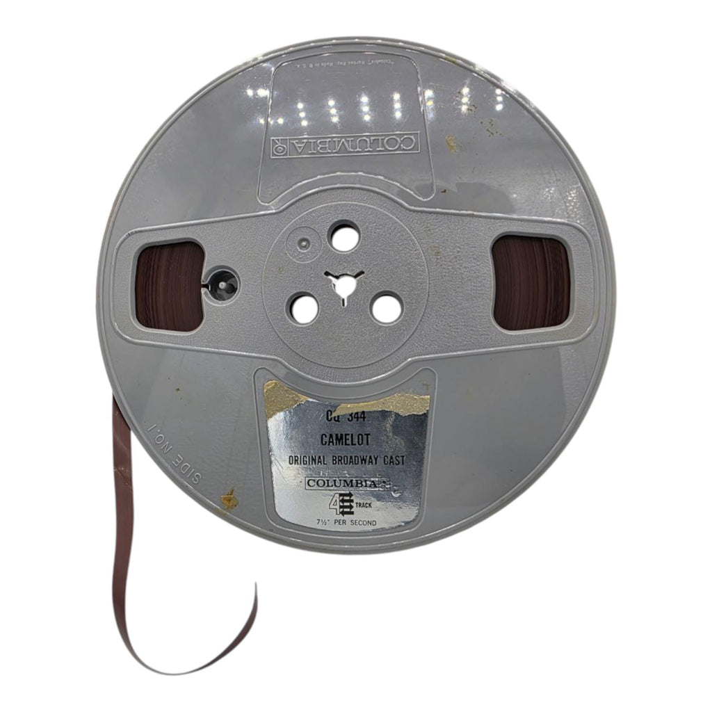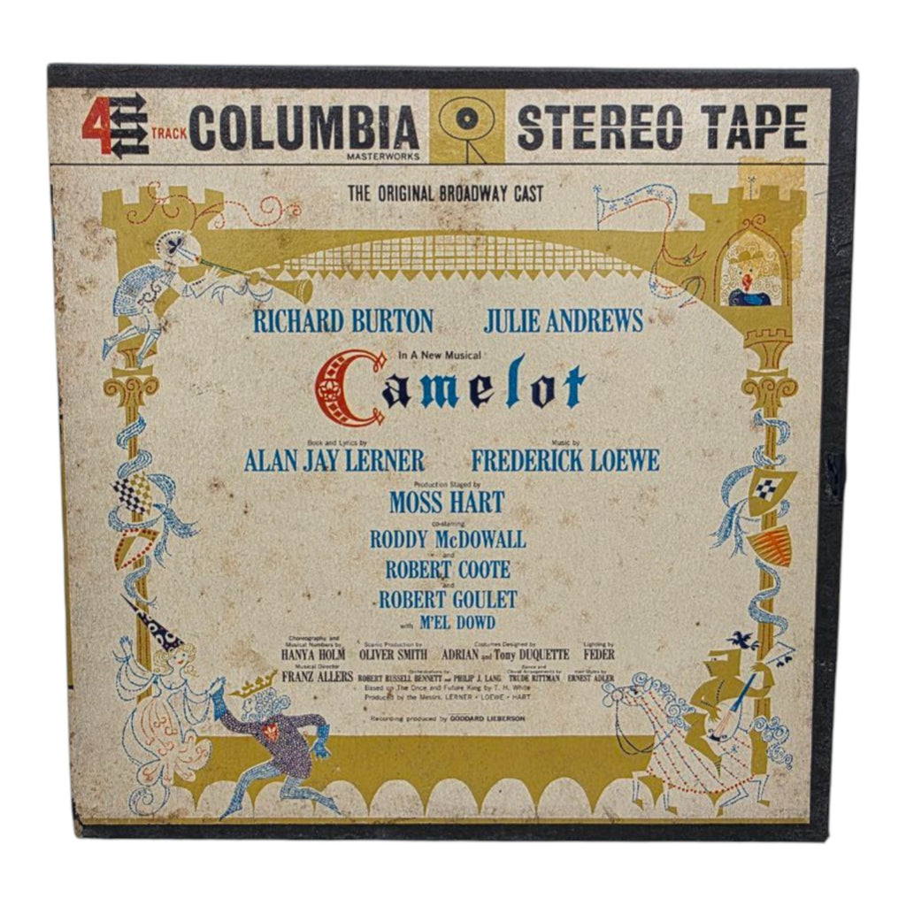 The product is a rare and vintage Camelot Original Broadway Cast Reel-to-Reel Tape from Columbia, released in 1961. This unique format offers high-fidelity sound quality in full-range, featuring various artists from the English-language soundtrack and musical genre. The multicolor tape comes in a cardboard sleeve and is a stereo unit with a 7 1/2 IPS speed. This collectible item is a must-have for music enthusiasts looking to experience the magic of Camelot in its original form.