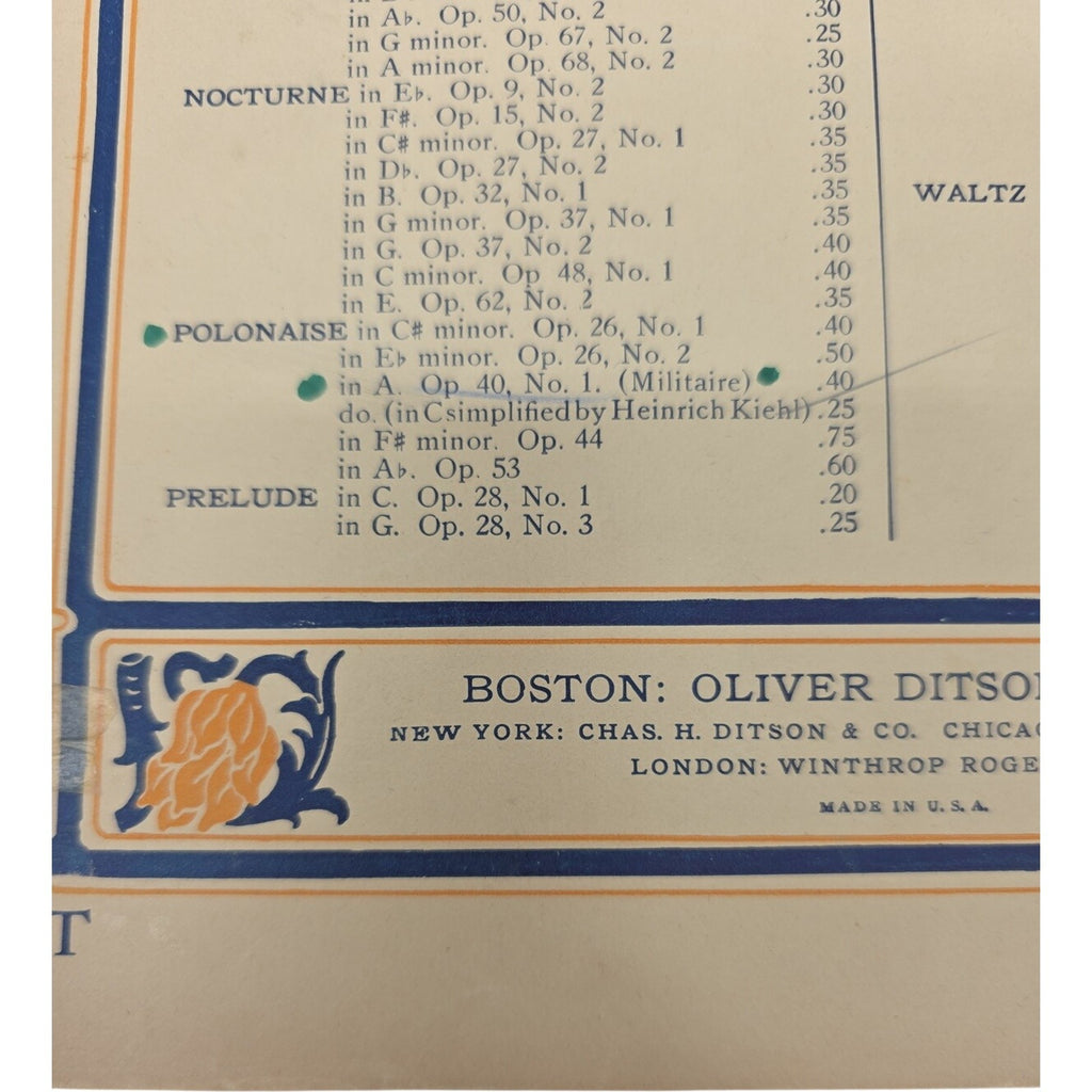 The product is a vintage sheet music for Chopin's Polonaise Militaire Op 40 No 1, published by Oliver Ditson Co in the United States. This sheet music is specifically for the piano instrument and falls under the classical genre. It is designed for intermediate level players and includes one unit quantity. The nostalgic value and historical significance of this piece make it a valuable addition to any musician's collection, perfect for those who appreciate classic piano compositions.