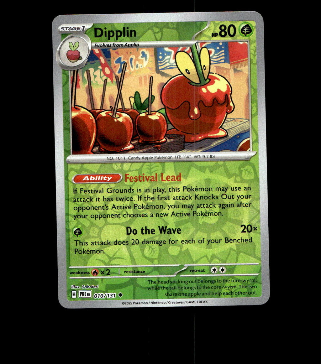 Dipplin - 010/131 - Prismatic Evolutions - Near Mint Reverse Holofoil Uncommon card from the 2024 Scarlet & Violet Prismatic Evolutions set. Listed in Near Mint condition – please refer to the photos for exact details on edges, corners, and surface. Photos are actual photographs of the exact card you will receive – not stock images.
