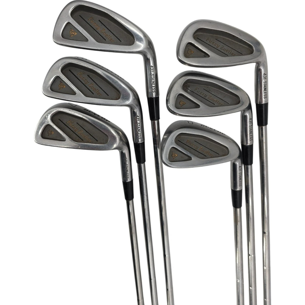 The Dunlop Fuzzy Zoeller 431 Stainless Irons 5-9+PW Six Golf Club Bundle FZ300 is a set of high-quality stainless steel golf clubs designed for right-handed male golfers. With a sleek silver color and a blade head shape, these irons offer precision and control on the course. The regular flex steel shaft provides a balanced feel, while the standard lie angle ensures consistent performance. This bundle includes six clubs - irons 5 through 9, along with a pitching wedge - making it an ideal choice for players looking to enhance their short game.