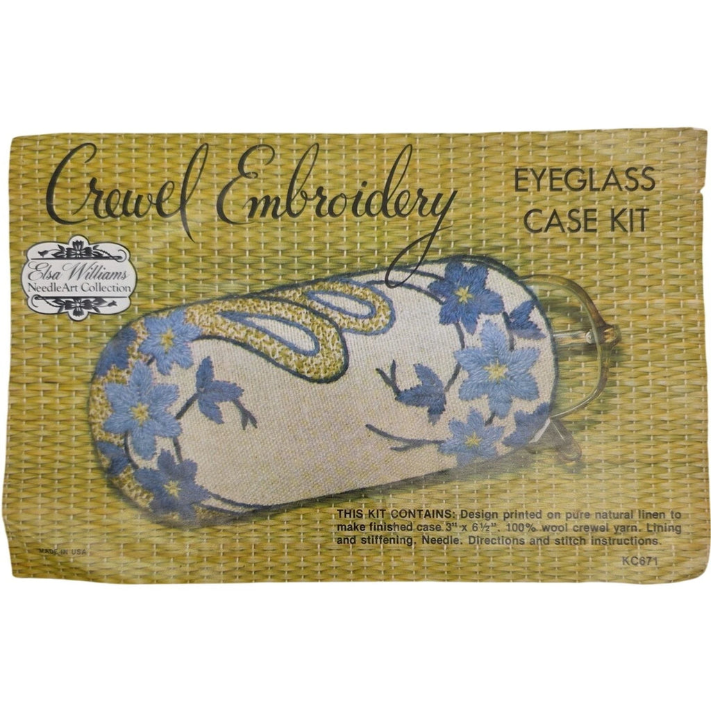 The Elsa Williams Crewel Embroidery Eyeglass Case Kit KC671 in Linen Floral Blue is a vintage craft kit that includes everything you need to create a beautiful floral eyeglass case. Made in the United States, this kit features a crewel embroidery design with a floral theme, perfect for anyone who enjoys hand embroidery and needlecrafts. The kit includes a linen base, needle, and blue crewel embroidered design, all neatly packaged in one convenient unit. Ideal for craft enthusiasts and those who appreciate unique handmade items.