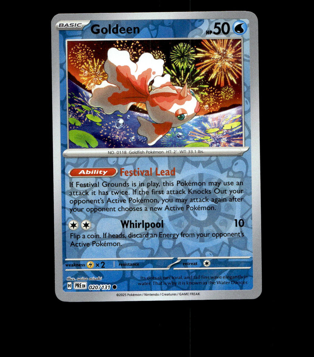 Goldeen - 020/131 - Prismatic Evolutions - Reverse Holo Near Mint Common card from the 2024 Scarlet & Violet Prismatic Evolutions set. Listed in Near Mint condition – please refer to the photos for exact details on edges, corners, and surface. Photos are actual photographs of the exact card you will receive – not stock images.