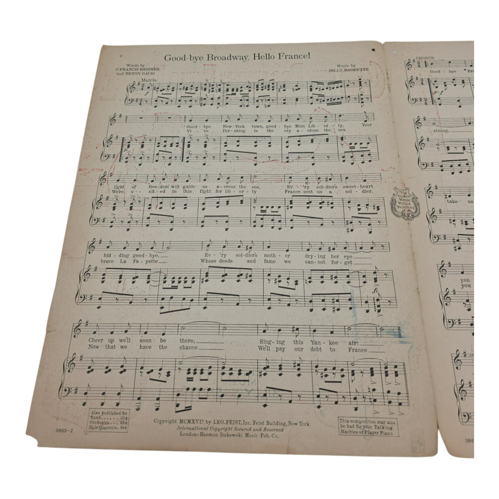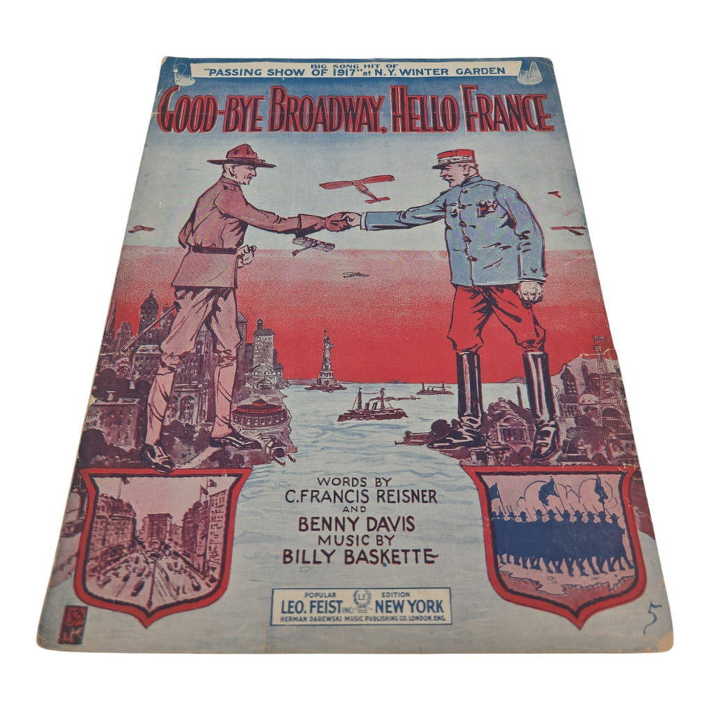 "Goodbye Broadway Hello France" by Reisner and Davis is a sheet music from 1917, originating from the United States during World War I. This item is a collectible piece of militaria that captures the sentiment and music of the era, featuring patriotic tunes and heartfelt compositions. With its historical significance and nostalgic charm, this sheet music serves as a unique glimpse into the cultural and musical landscape of the time.