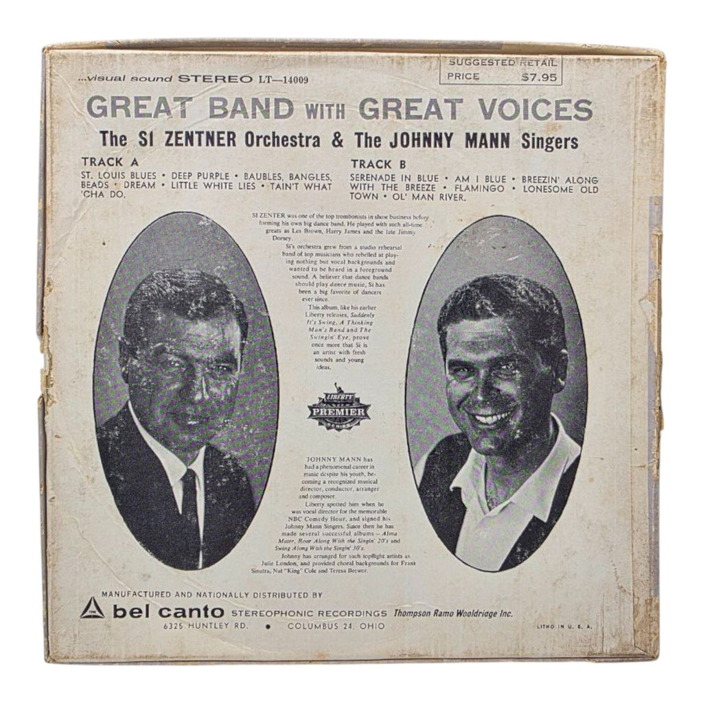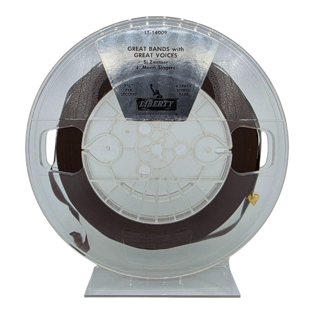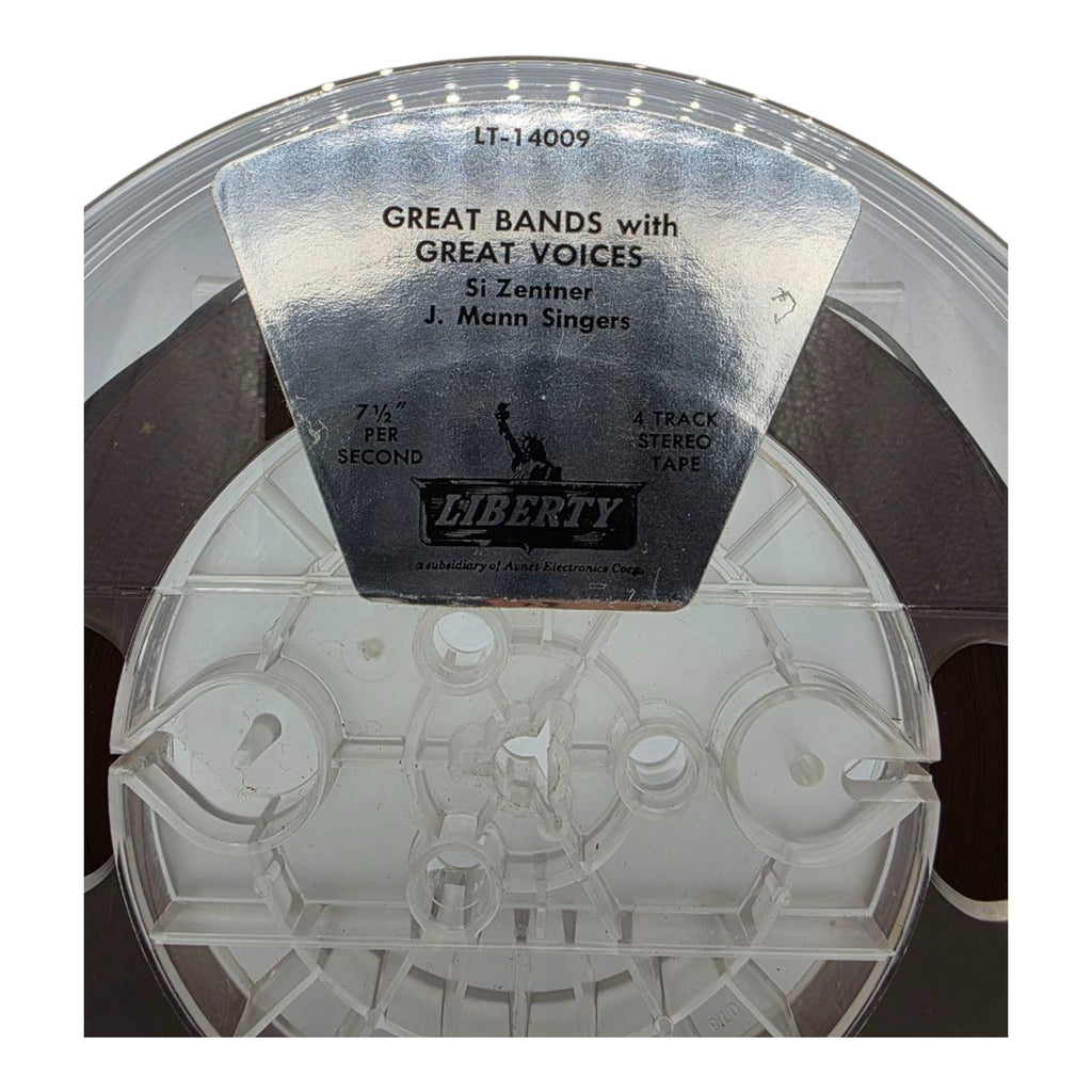 The product is a reel-to-reel tape featuring the music of Si Zentner and The Johnny Mann Singers, released under the title "Great Band with Great Voices Si Zentner Orchestra" by Liberty Records. The tape includes English language tracks showcasing voice instrumental music in Big Band & Swing and Easy Listening styles. With a stereo format and high fidelity stereophonic features, this 31:39 run time album offers a unique listening experience for fans of pop and jazz genres. The multicolor cardboard sleeve packaging adds to the aesthetic appeal of this collector's item from the United States.