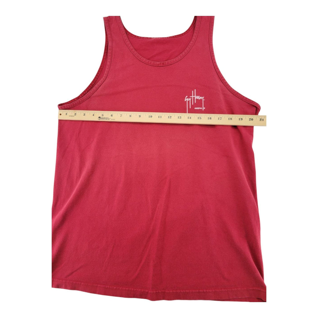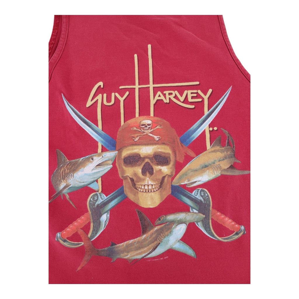 The Guy Harvey Red Tank Top in size L featuring a graphic print of a pirate skull and sharks is a stylish and unique addition to any man's wardrobe. Made of cotton knit fabric, this sleeveless t-shirt has a round neck and regular fit. Easy to care for with its machine washable design, this vibrant red shirt is perfect for those who appreciate a blend of pirate and shark themes in their clothing choices. With the iconic Guy Harvey brand, this tank top unit is sure to stand out and make a statement.