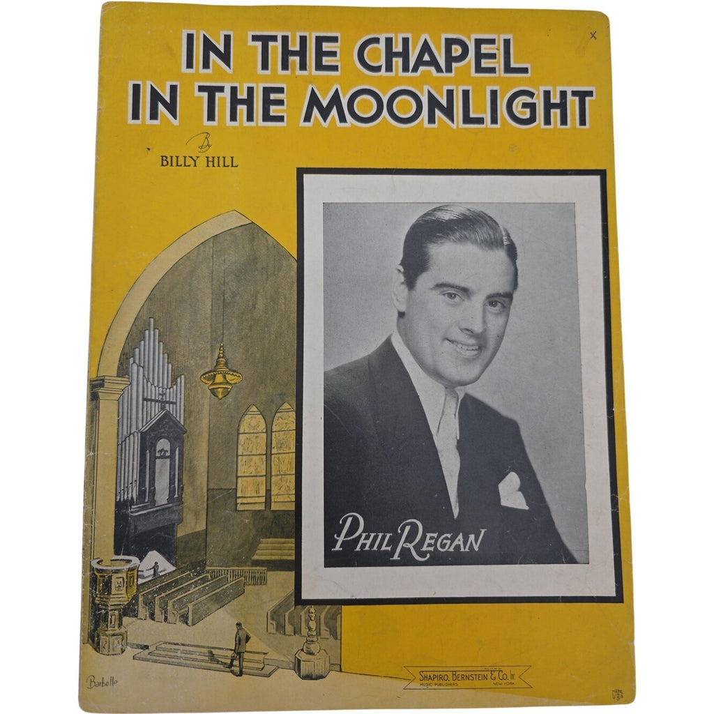 The product is vintage sheet music for the song "In the Chapel in the Moonlight" from 1936, written by Billy Hill and featuring Phil Regan. Published by Shapiro, Bernstein & Co., Inc in the United States, this musical piece falls under the genre of Musicals. The sheet music is a single unit and is a part of the Vintage & Antique collection, perfect for enthusiasts of musical instruments and gear looking to play nostalgic tunes from the past.