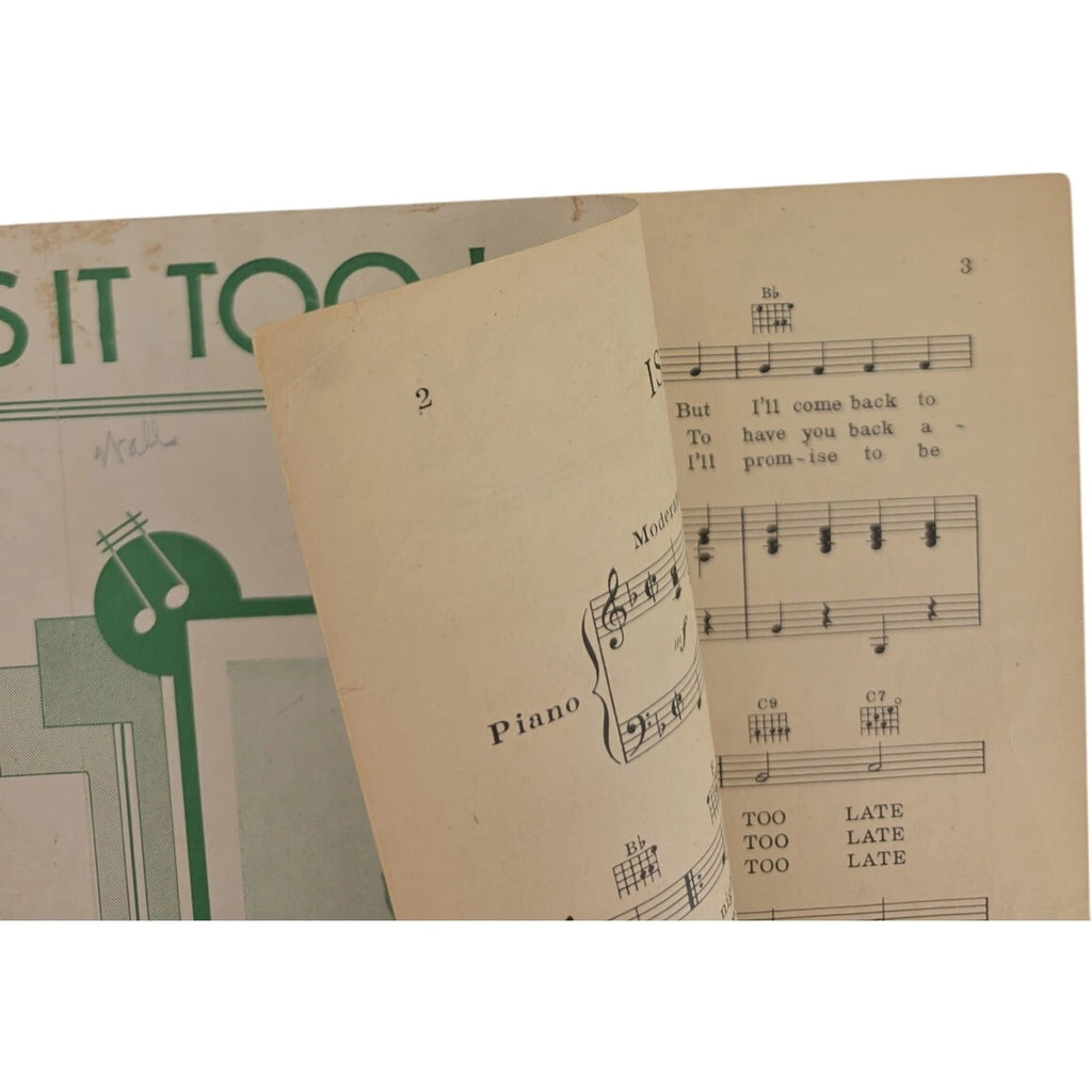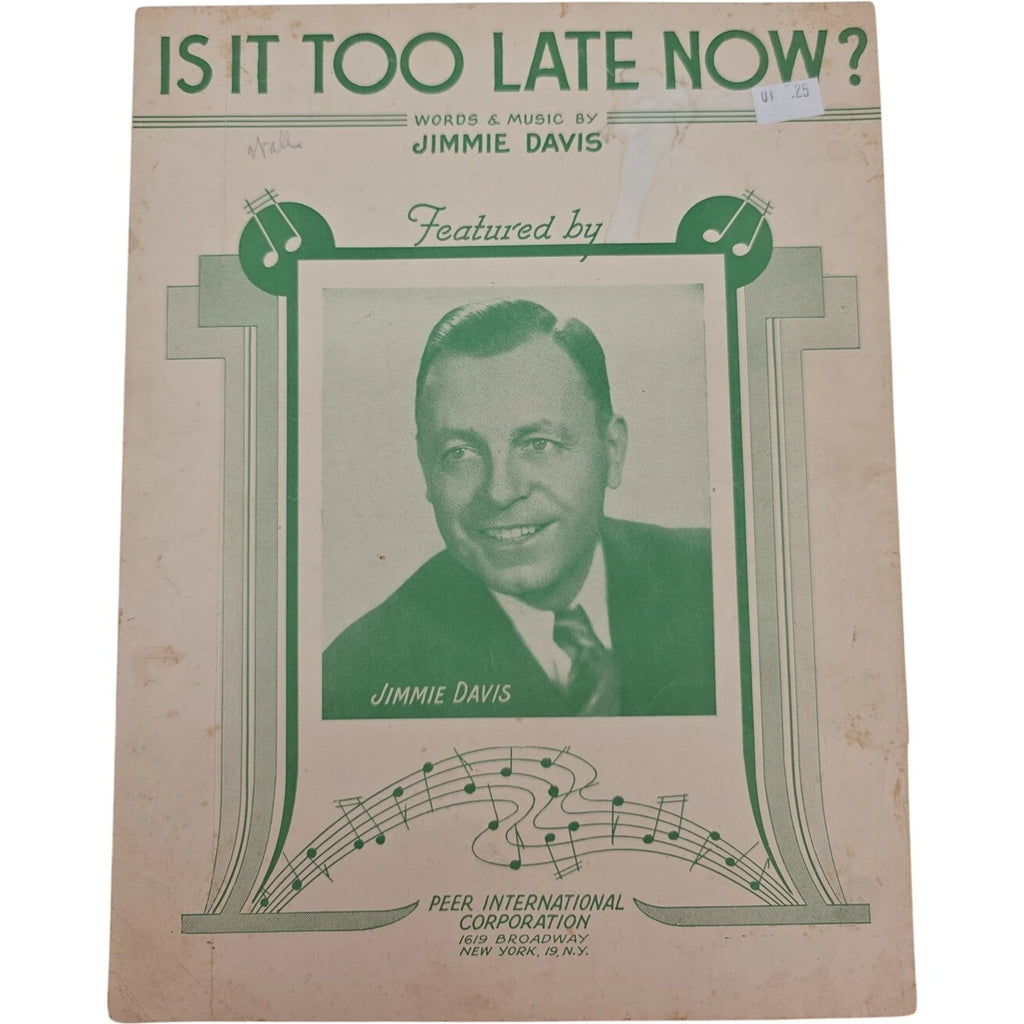 The product is a vintage sheet music titled "Is It Too Late Now Words and Music by Jimmie Davis 1944" published by Peer International Corporation in the United States. The sheet music is for piano and falls under the genre of Musicals. This item is a nostalgic collectible for music enthusiasts and vintage sheet music collectors, offering a glimpse into musical compositions and styles from the past.