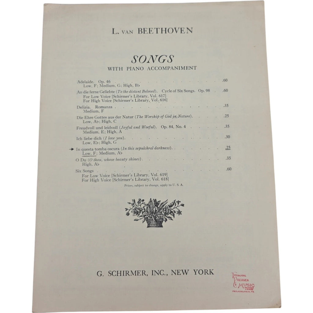 This product is vintage classic sheet music featuring songs by L. van Beethoven with piano accompaniment. Published by G. Schirmer, Inc in the United States, the sheet music is ideal for piano players looking to perform iconic compositions by the renowned classical music artist. Each unit contains one sheet music collection that allows musicians to recreate the beauty and complexity of Beethoven's works with the accompaniment of a piano. This item is perfect for both collectors and performers of classical music.