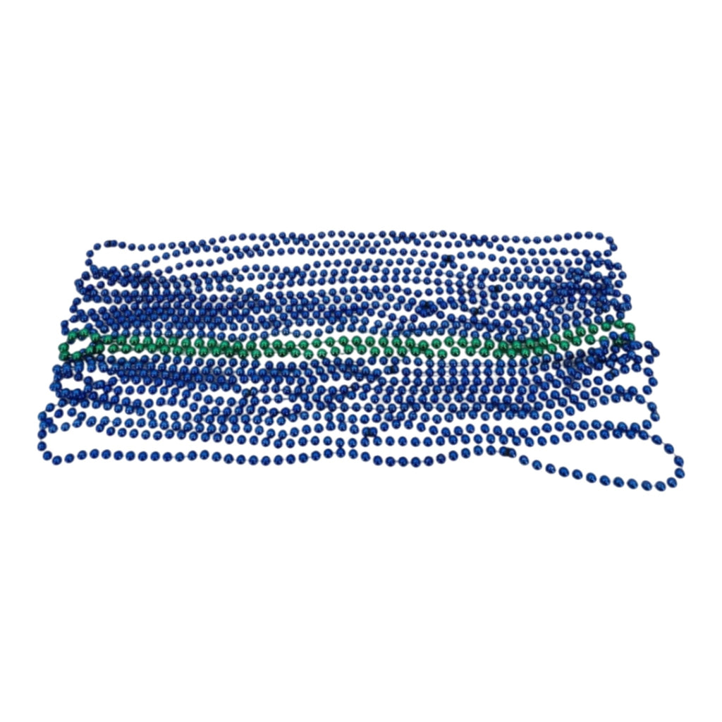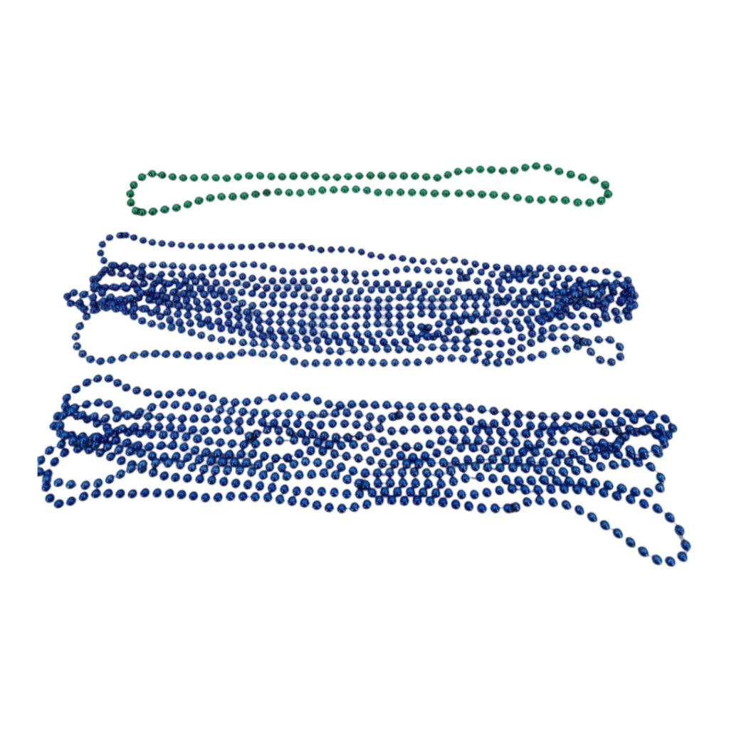 The product is a lot of 12 round blue and green Mardi Gras beads, each measuring 15 inches in length. These beads are perfect for craft projects and jewelry making, adding a vibrant and festive touch to any creation. With their classic round shape and vibrant colors, these beads are sure to enhance any craft project with a touch of Mardi Gras spirit.