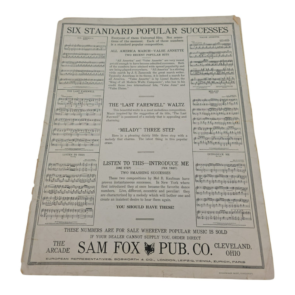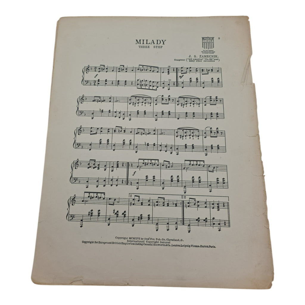 The product is vintage sheet music for the piano, specifically for the song "Three Steps" by J.S. Zamecnik. This sheet music falls under the genre of Musicals and is a single unit. It is a unique and nostalgic piece for collectors of vintage music memorabilia or for those interested in playing classic musical compositions on the piano.