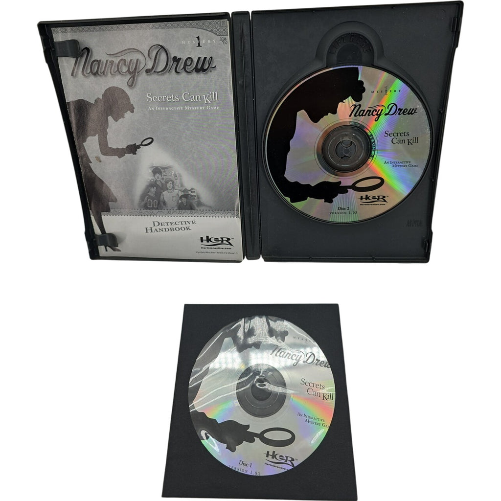 The product is a PC CD-ROM mystery adventure game titled "Nancy Drew: Secrets Can Kill." Published by DreamCatcher Interactive, this game is part of the popular Nancy Drew video game series. It falls under the genres of action/adventure, adventure, mystery, and action/adventure, making it suitable for players of all ages with an E rating. The game is tested and confirmed to be in working condition, with the region code set for NTSC-U/C (US/CA).