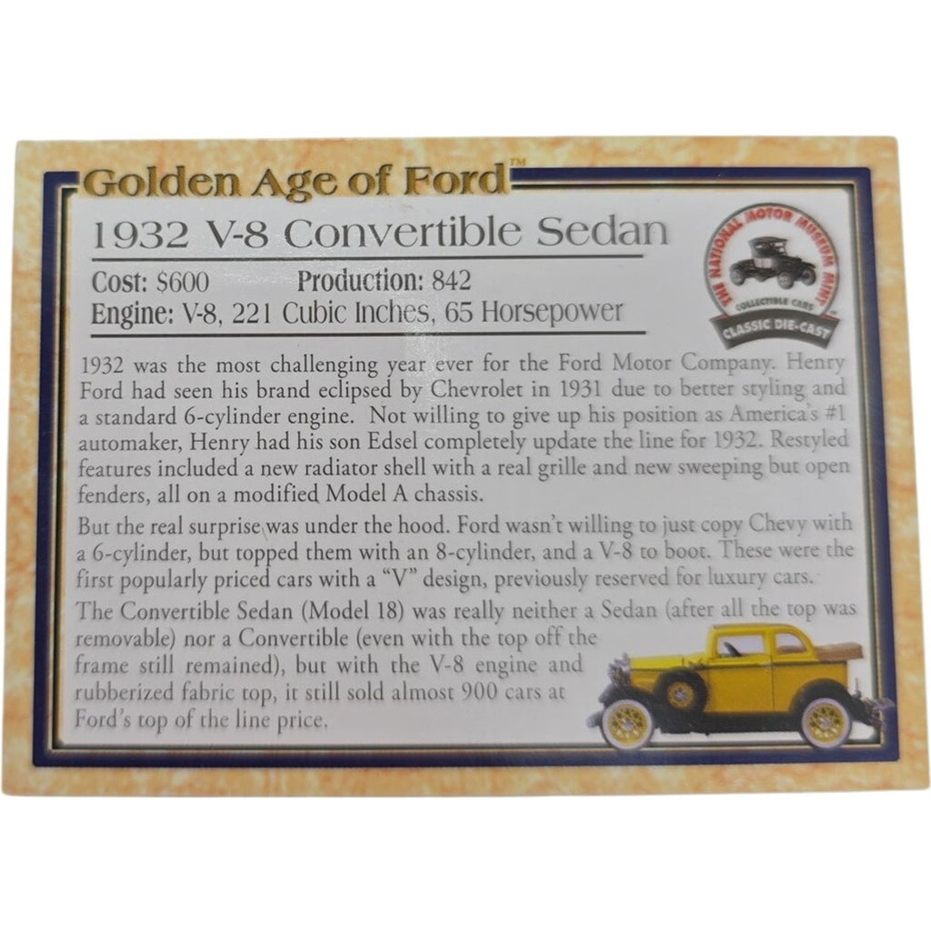 The National Motor Museum Mint 1932 Ford Convertible Sedan Die-cast Car SS-T5351 is a highly detailed scale model of a classic Ford car. Made of die-cast material and featuring a vibrant yellow color, this toy vehicle is perfect for collectors or enthusiasts of vintage cars. The convertible sedan design adds a touch of nostalgia to any collection, and the 1:32 scale makes it a great display piece for showcasing the fine craftsmanship of this iconic 1932 Ford model.