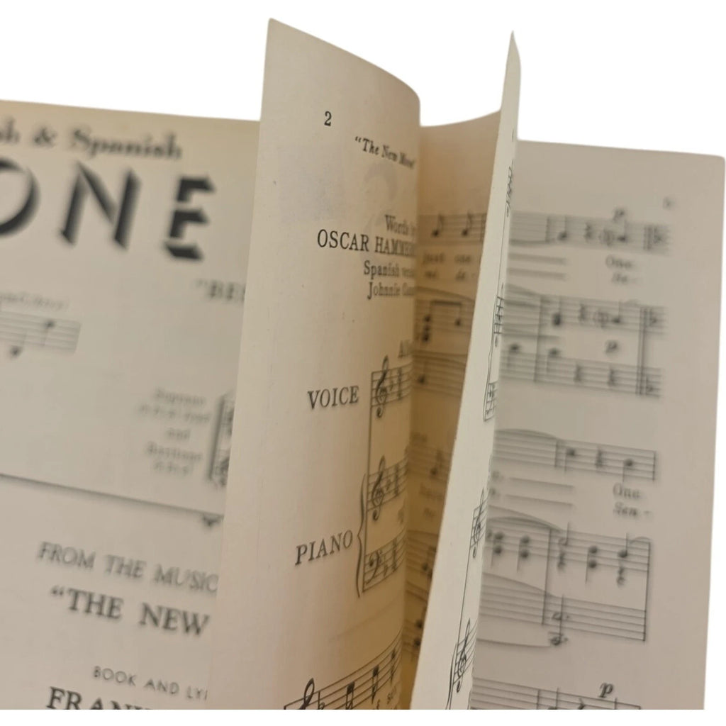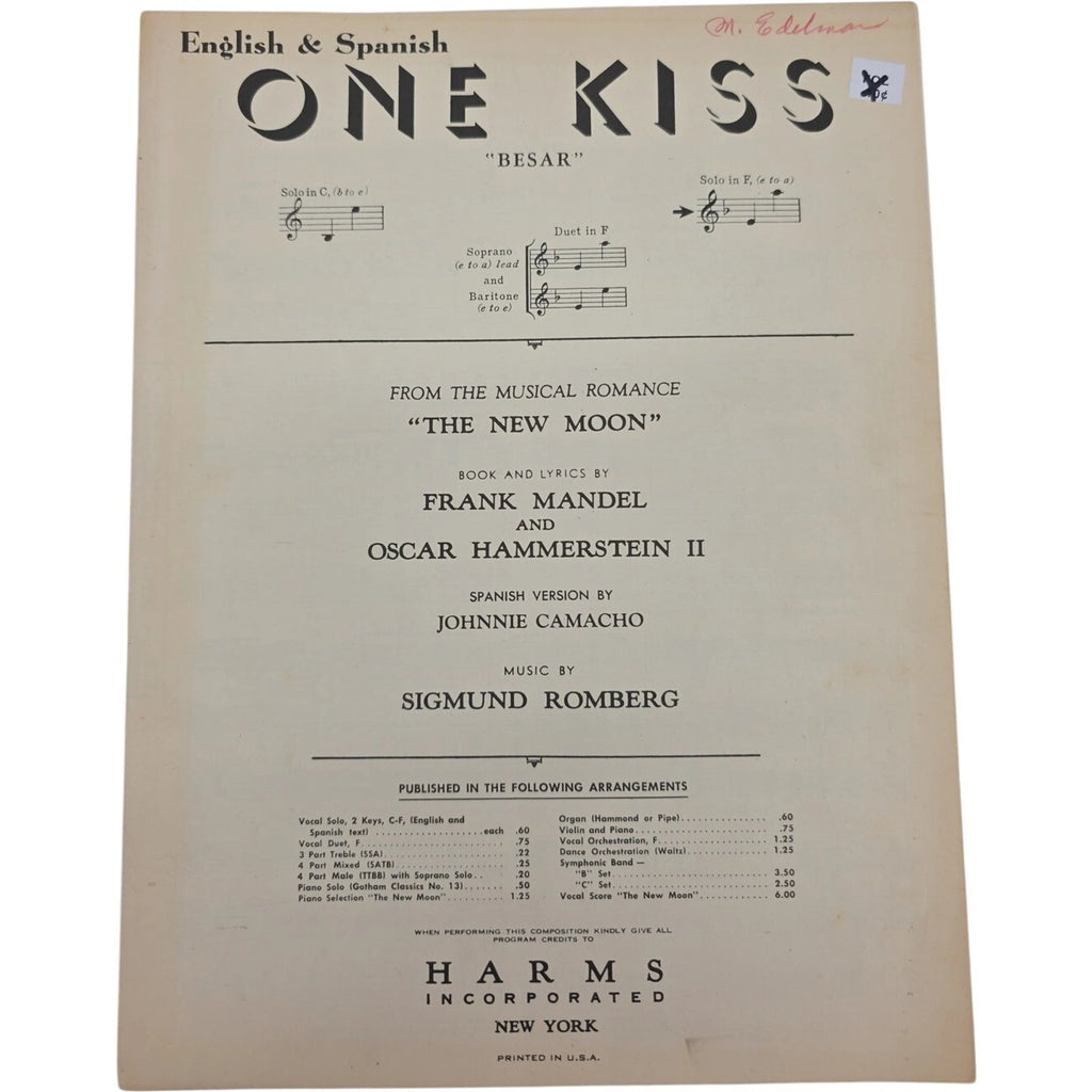 The product is one sheet music unit featuring the song "One Kiss Besar" from the musical The New Moon. It includes both English and Spanish translations, making it suitable for a diverse audience. Published by Harms in the United States, this intermediate-level sheet music is designed for piano and orchestra ensembles, catering to fans of musicals and classical genres. Perfect for musicians looking to add a unique piece to their repertoire, this vintage sheet music captures the essence of the captivating musical composition.