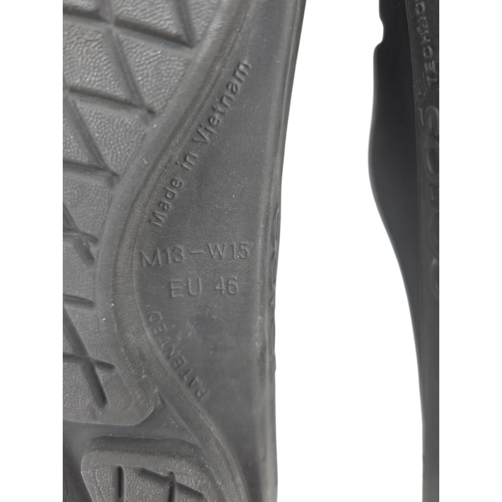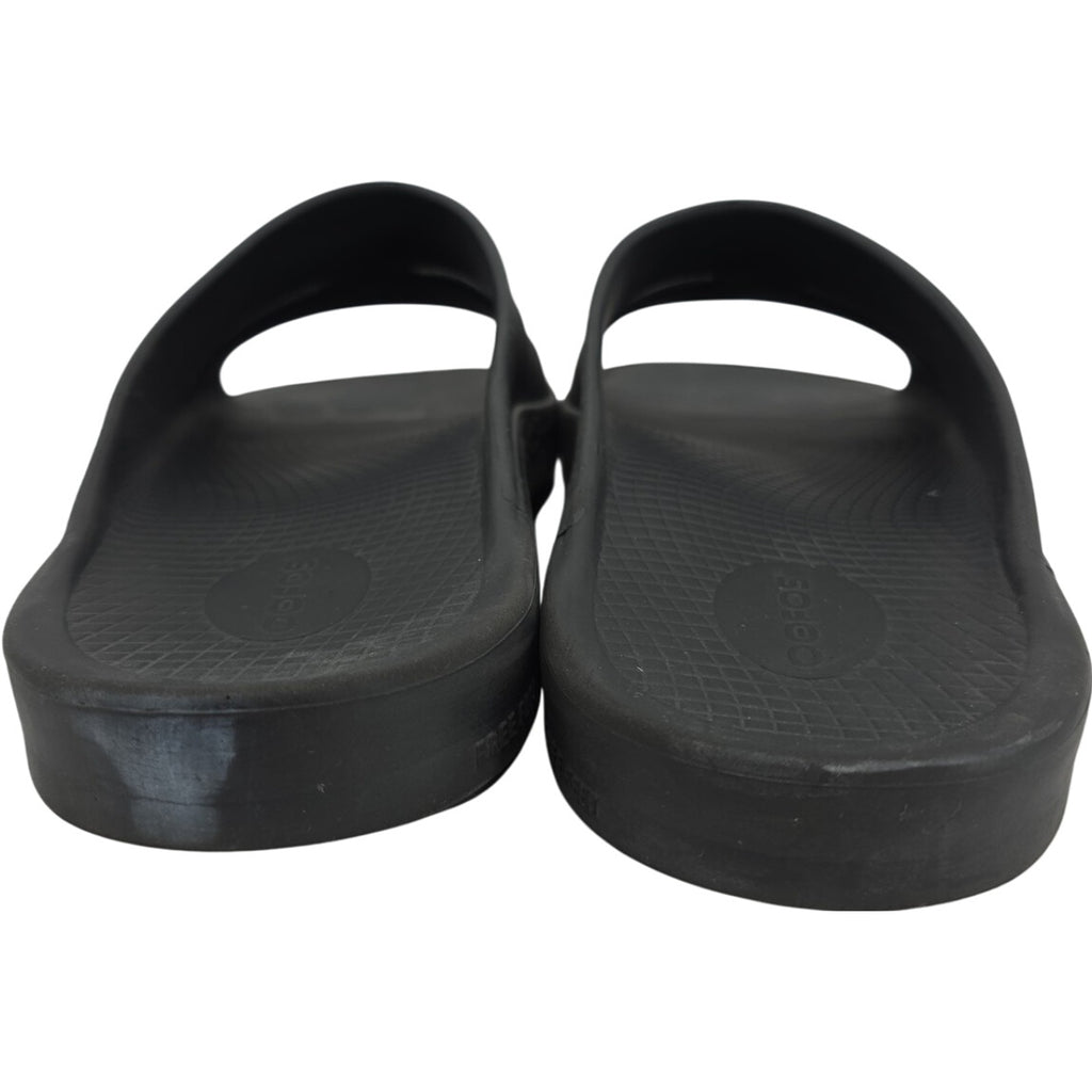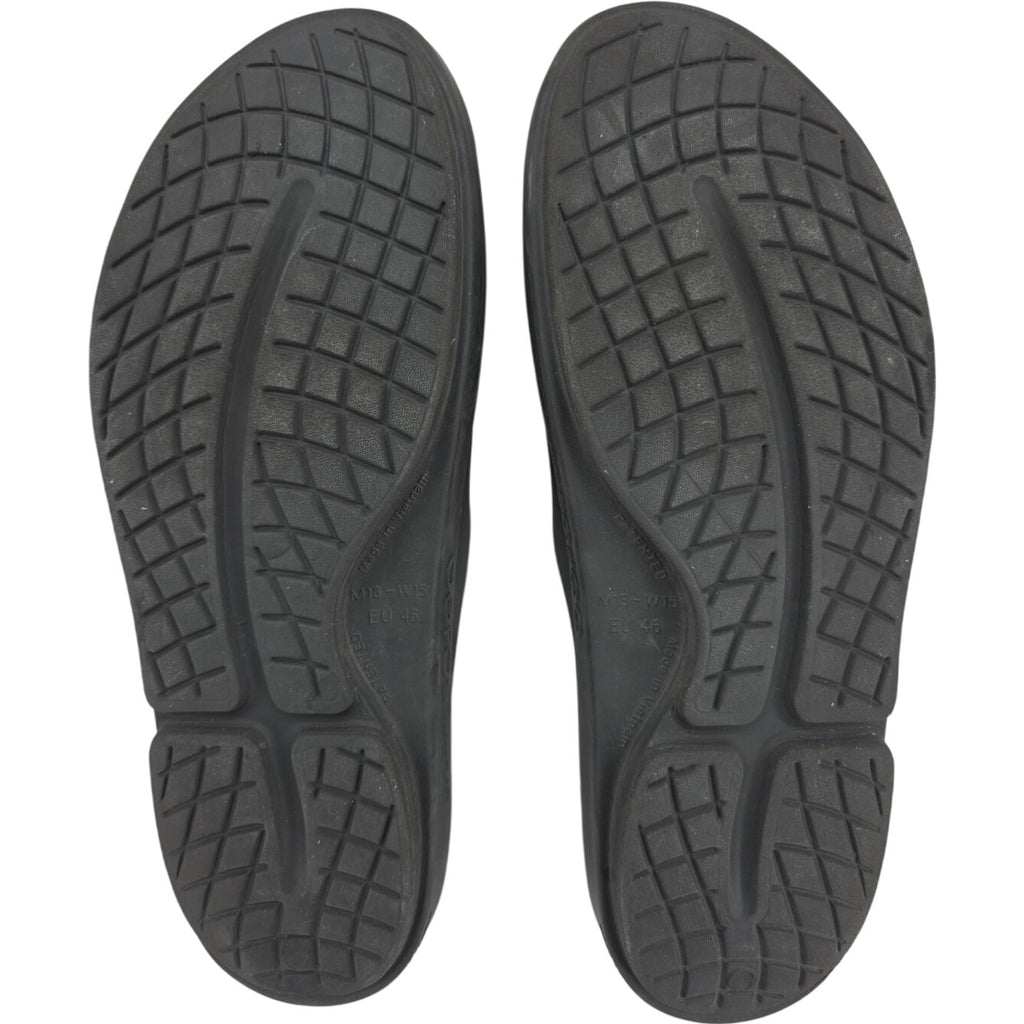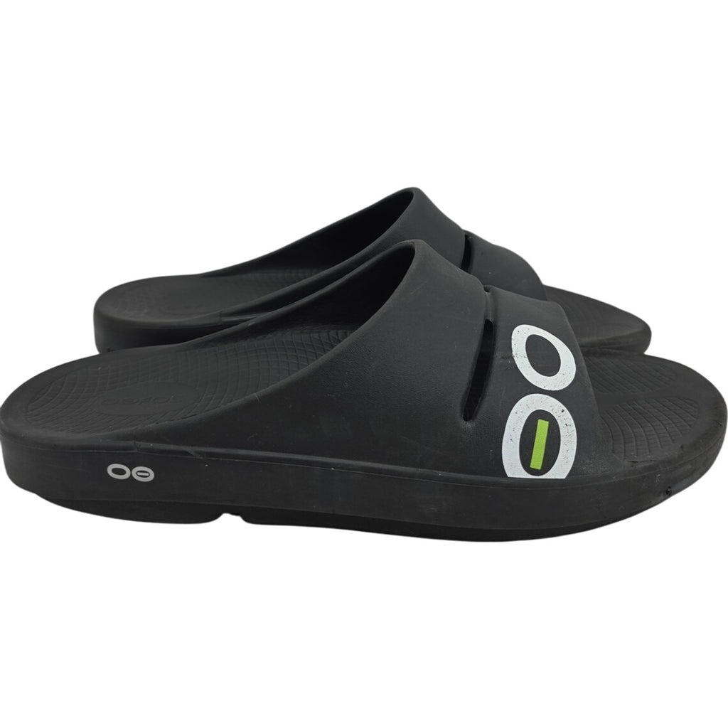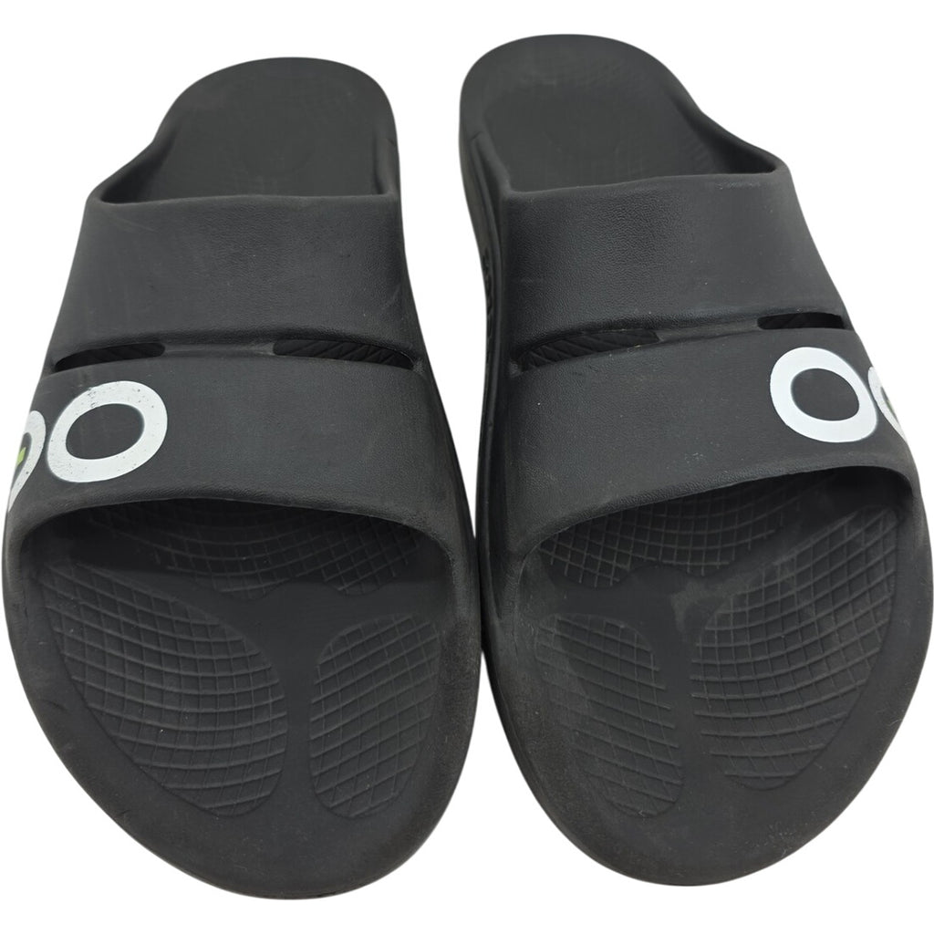 The OOFOS OOahh Slide Sandals in Black, size M13/W15 (EU46), are designed for ultimate recovery and comfort for women. These sandals feature a solid black color with the brand logo accent, a slide style, and medium shoe width for a comfortable fit. Made with synthetic upper material and a focus on comfort, these sandals are perfect for providing support and relief for your feet after a long day or during recovery. Ideal for those in need of specialized footwear to aid in foot health and comfort.