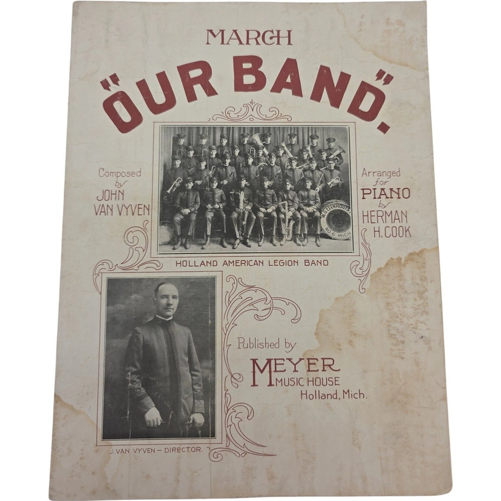 The product is a vintage sheet music titled "Our Band March 1924" by John Van Vyven Holland American Legion Band. It is in piano format and published by Meyer Music House in the United States. This sheet music allows musicians to play the nostalgic march from 1924, showcasing the musical style and event of that time period.