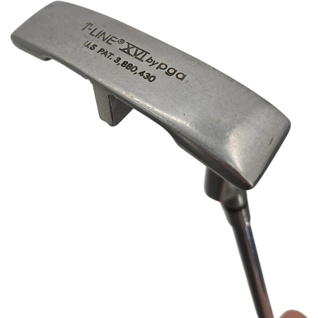 The PGA T-Line XVI Putter Golf Club is a premium men's right-handed club with a 35" steel shaft and Pro Only grip. The stainless steel head and blade shape are designed for precision and control on the golf course. This putter, with a loft of 1° and a bounce of 1°, is perfect for making smooth and accurate strokes. Made in the United States, this club is part of the PGA brand's T-Line XVI series, ensuring top quality and performance for serious golfers looking to improve their game.