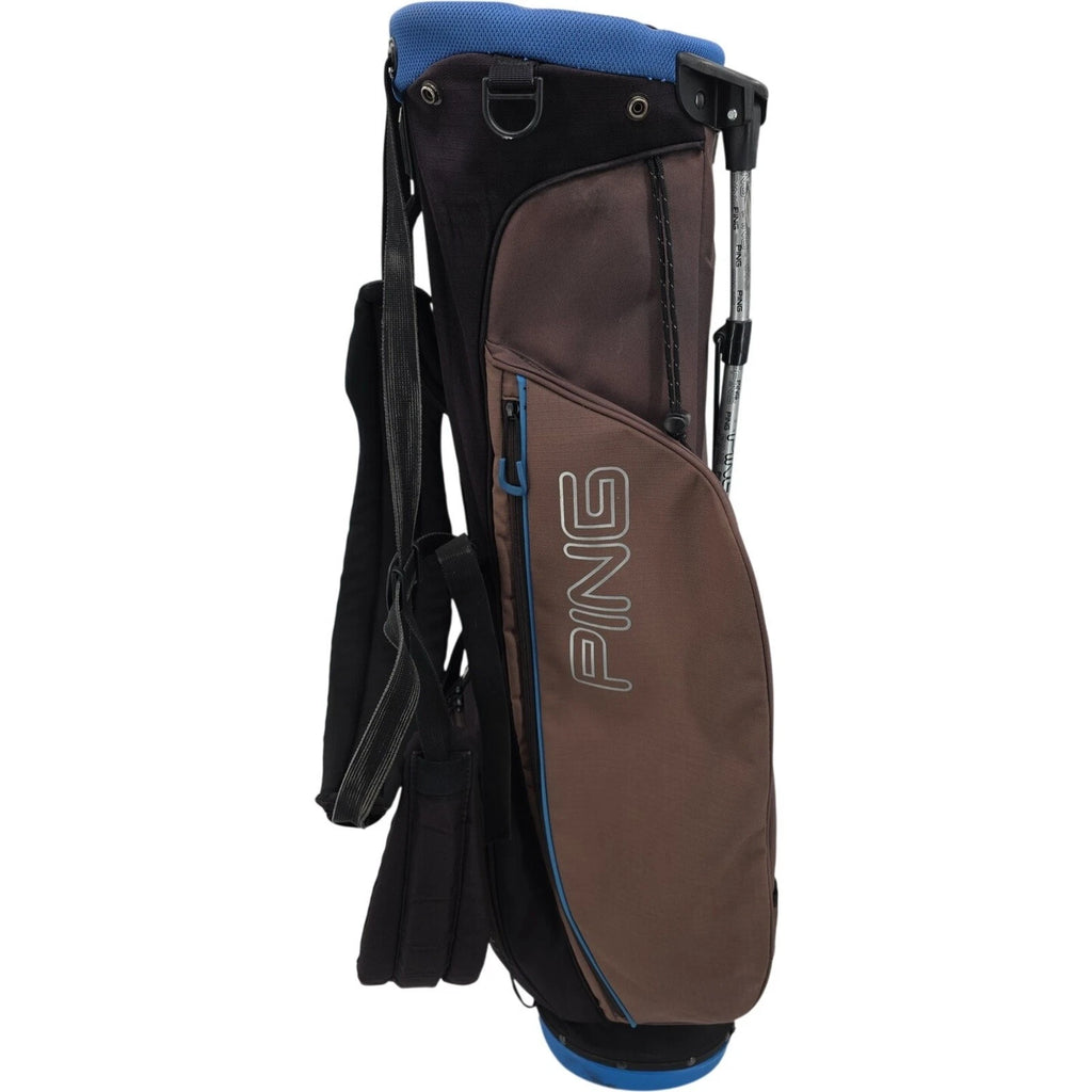 The PING Stand Golf Bag is a versatile and stylish option for golf enthusiasts, featuring a 4-way top for organizing clubs and a zip closure for easy access. Made of durable nylon with a plastic and metal frame, this lightweight bag is designed for comfort and convenience. The dual strap carry system is padded for added comfort, while the ergonomic handle provides a secure grip. With its sporty design and practical features, this PING golf bag is the perfect companion for any golf course.