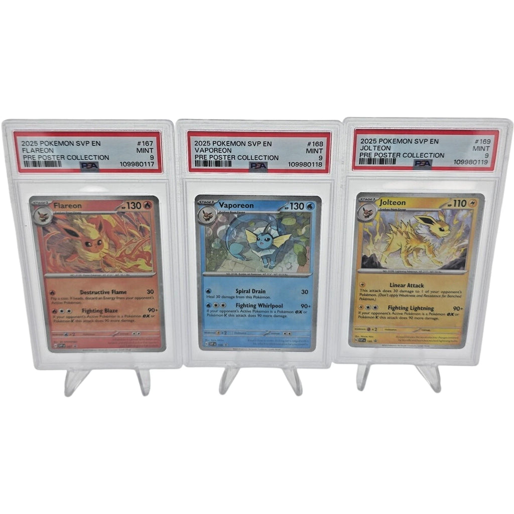 The product is a set of three Pokémon TCG cards featuring the characters Flareon, Vaporeon, and Jolteon in their Cosmoss Holo finish. These promo cards are from the Scarlet & Violet set and are in English language. Each card showcases the unique abilities and attributes of the respective Pokémon characters, making them highly desirable for collectors and players alike. The holo finish adds a special touch to the cards, making them even more appealing to fans of the Pokémon franchise.