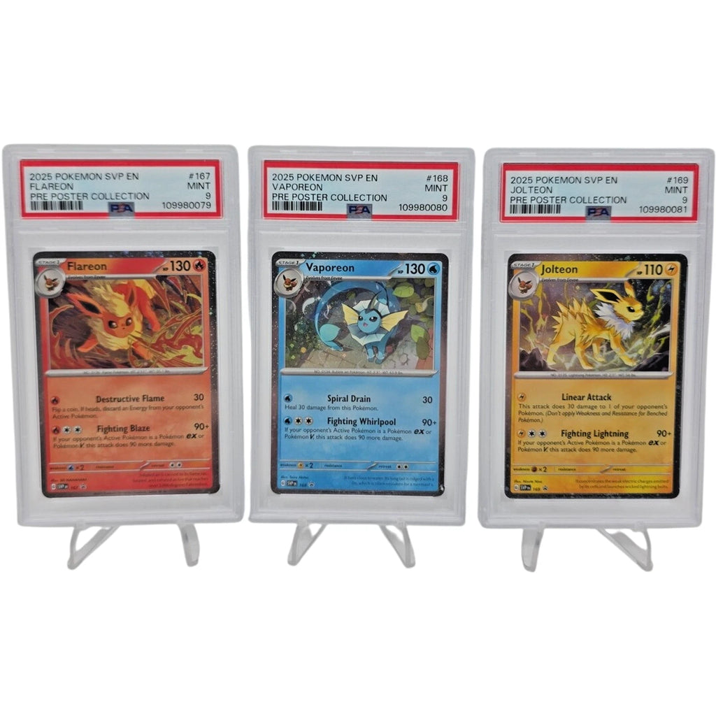 The product is a set of Pokémon TCG promo cards featuring the characters Flareon, Vaporeon, and Jolteon. The cards are from the Sv: Scarlet & Violet set and are in English. The set includes cards with the numbers 167, 168, and 169, each adorned with a Cosmos Holo design. These collectible cards are highly sought after by Pokémon TCG enthusiasts and collectors.