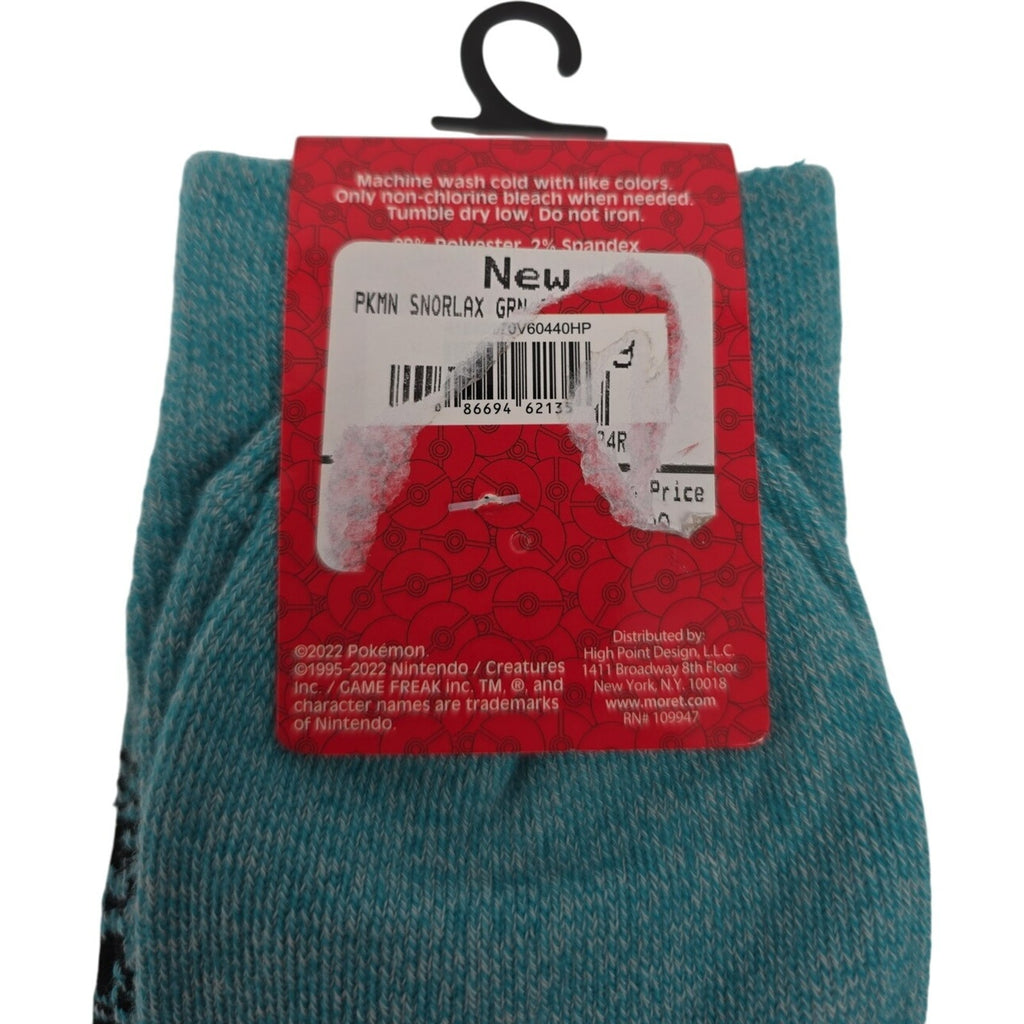 The product is a pair of Pokémon Snorlax Crew Socks in a blue color, size 6-12. These unisex adult socks feature the popular Pokémon character Snorlax and are designed for comfort and style. Made by the brand Pokemon, these crew socks offer a fun and unique addition to any outfit, with a focus on the theme of eat, sleep, and battle. Perfect for any Pokémon fan looking to add a touch of personality to their wardrobe.