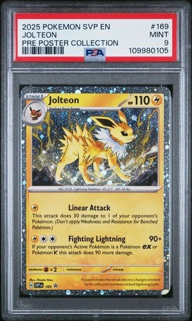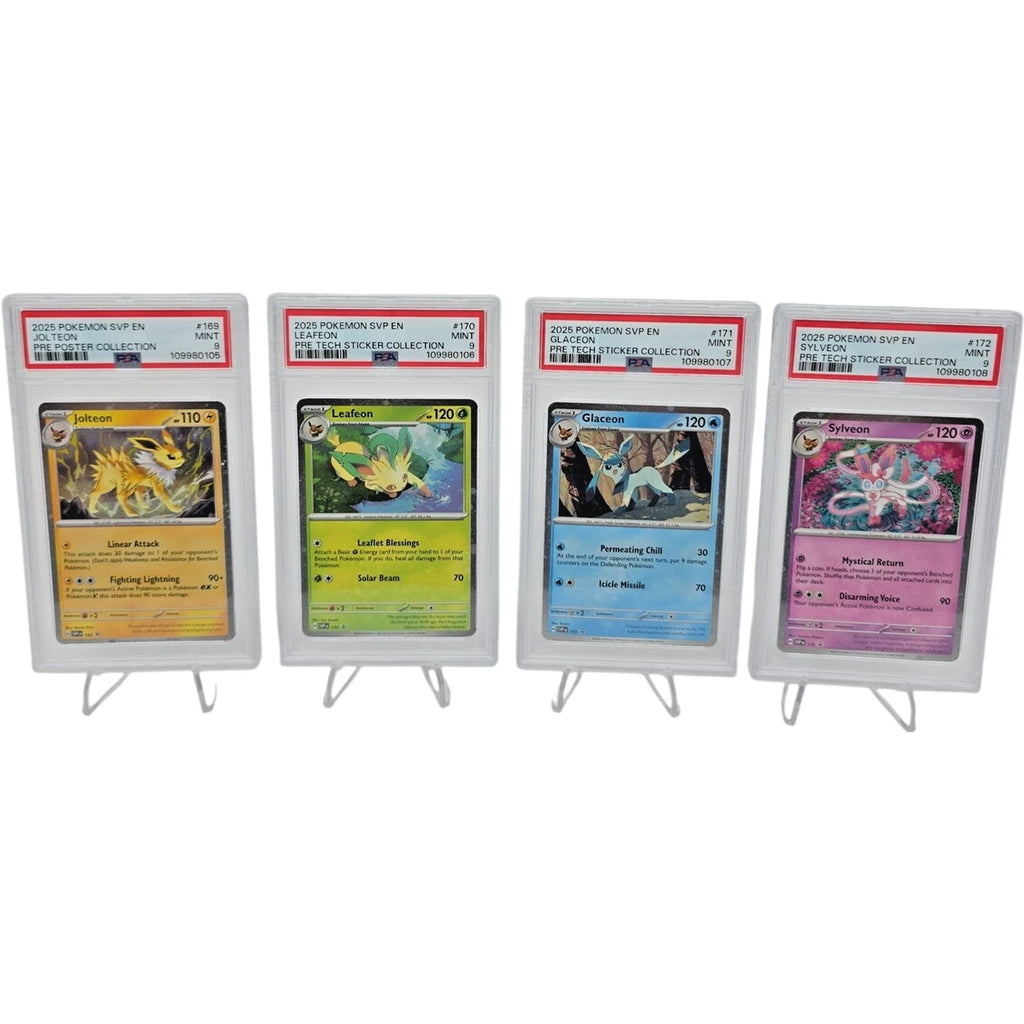 The product is a Pokémon TCG Set featuring the characters Glaceon, Jolteon, Sylveon, and Leafeon. Manufactured in 2025, this set includes collectible cards of these iconic Pokémon. As a PSA 9 graded product, it holds value for collectors and fans of the Pokémon Trading Card Game. This set offers a special addition to any Pokémon card collection, capturing the essence of these beloved characters in a visually appealing and sought-after format.