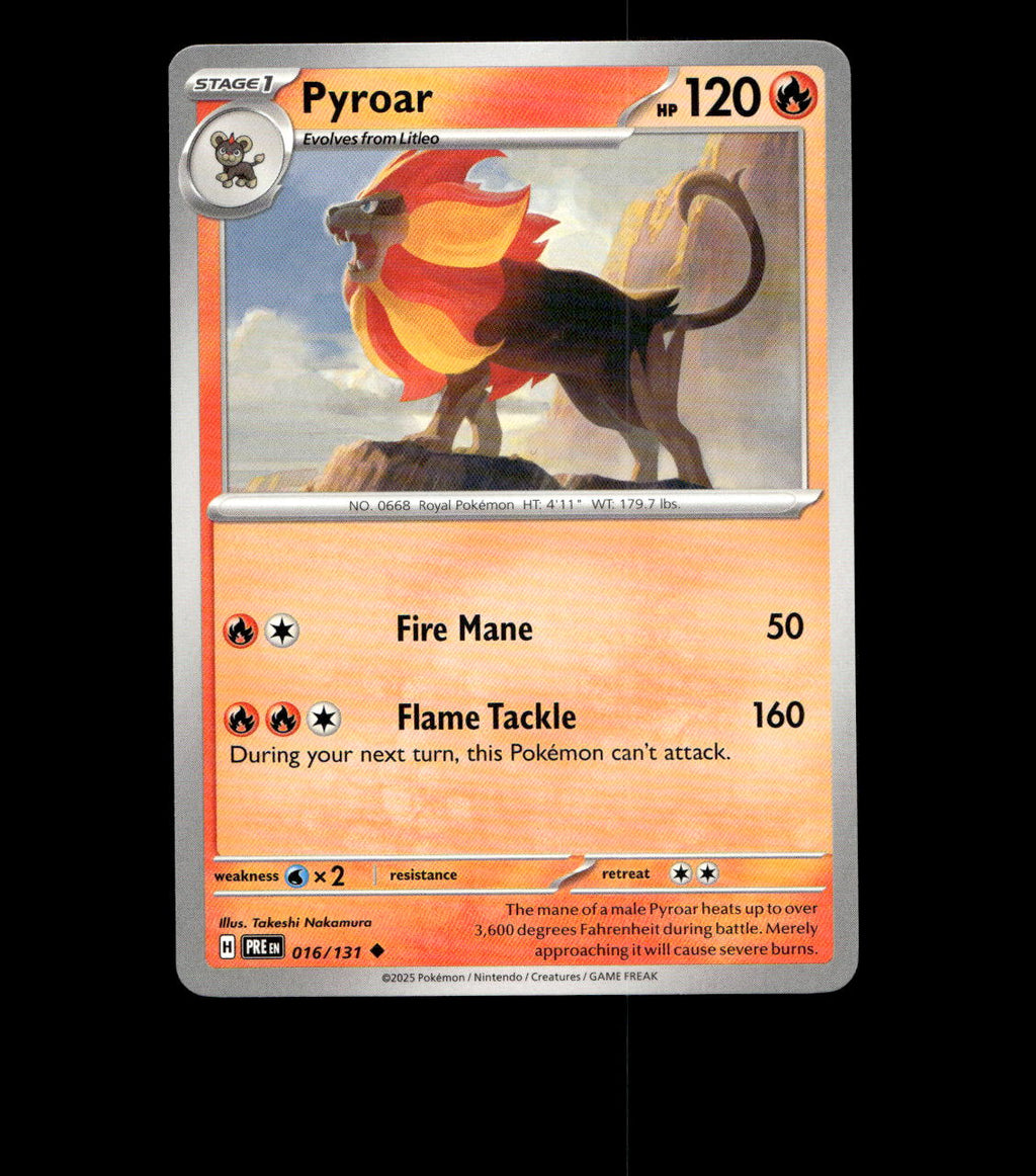 Pyroar - 016/131 - Prismatic Evolutions - Near Mint original uncommon card from the Prismatic Evolutions set. Listed in Near Mint condition – please refer to the photos for exact details on edges, corners, and surface. Photos are actual photographs of the exact card you will receive – not stock images.