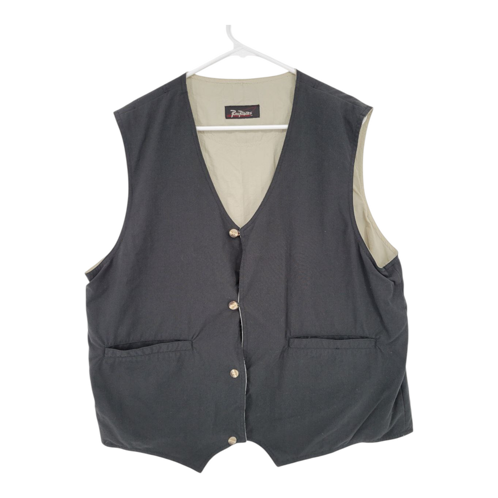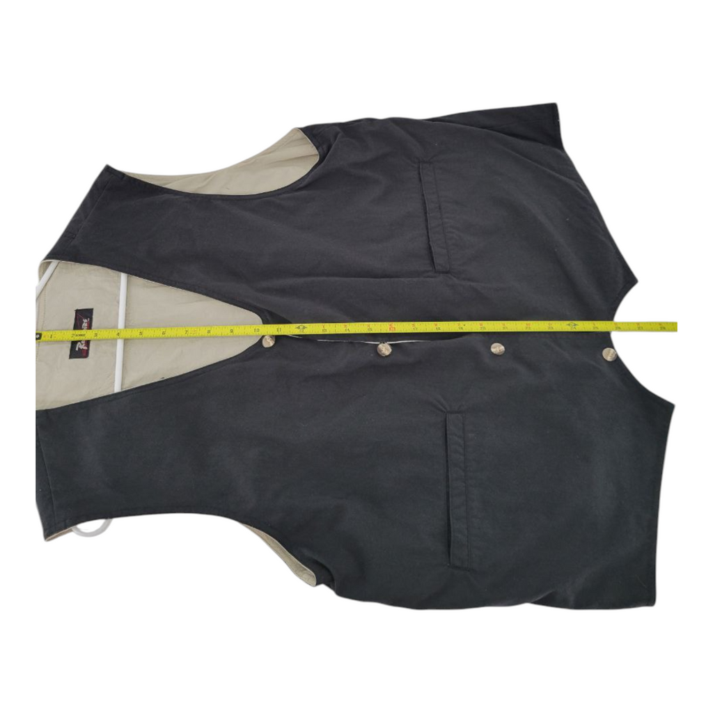 Crafted for the outdoor enthusiast and the hardworking professional, the RailRiders men's vest combines functionality with casual style. This vest features a durable cotton blend outer shell in a sleek black color, accented with a tan lining and multicolor button loop details. Designed to fit comfortably in a regular size approximating 3XL, it offers ample space for movement and layering.