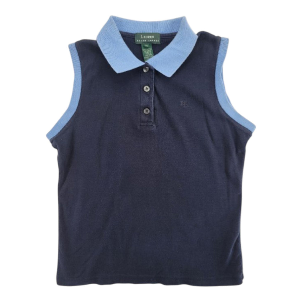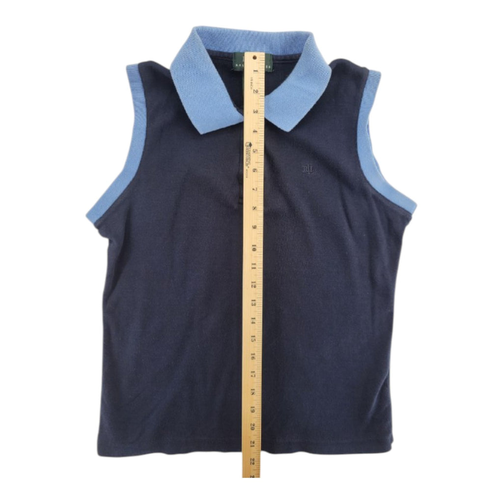 This Ralph Lauren Women's Navy Sleeveless Polo Shirt is a stylish and classic addition to any woman's wardrobe. Made from 100% cotton with a knit fabric type, this top features a contrast collar for added flair. The pullover closure and regular fit make it perfect for casual occasions, while the breathable and lightweight material ensures comfort. Pair it with your favorite bottoms for a timeless and effortless look.