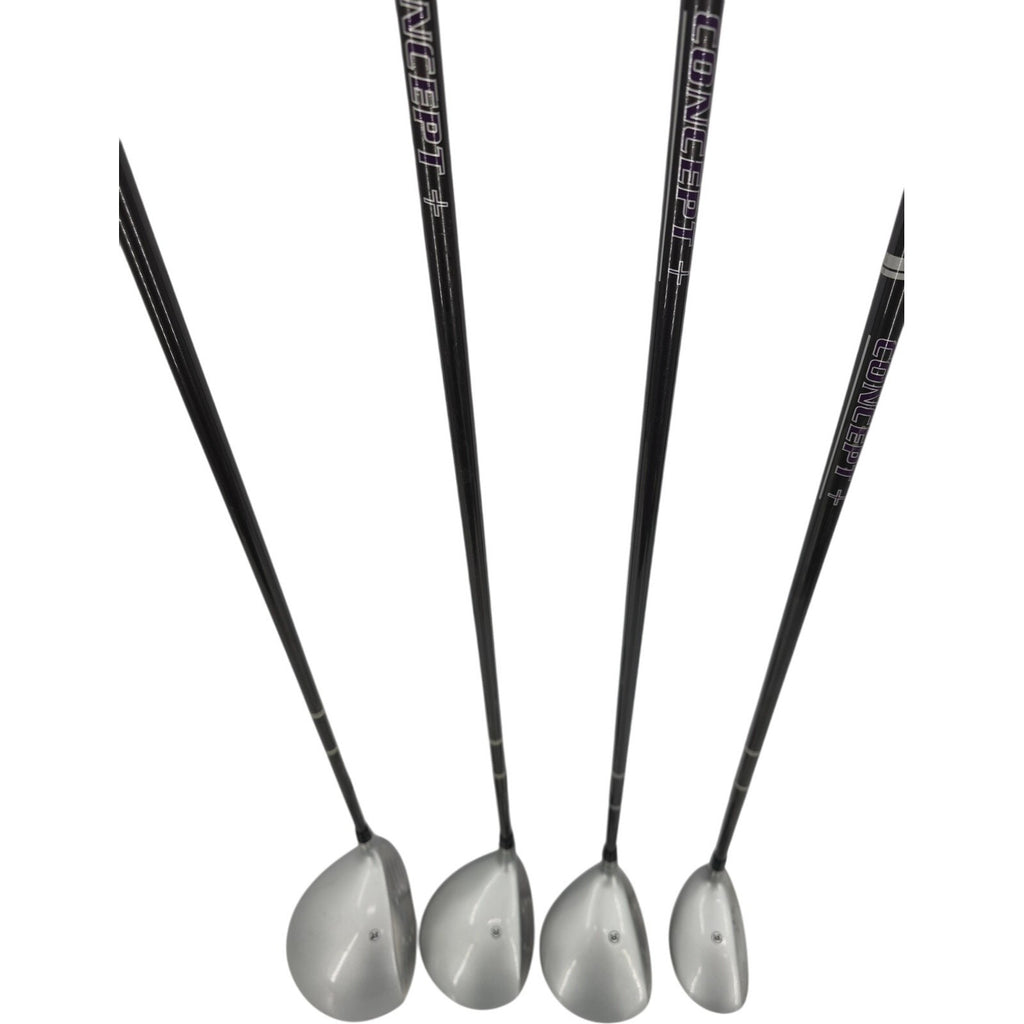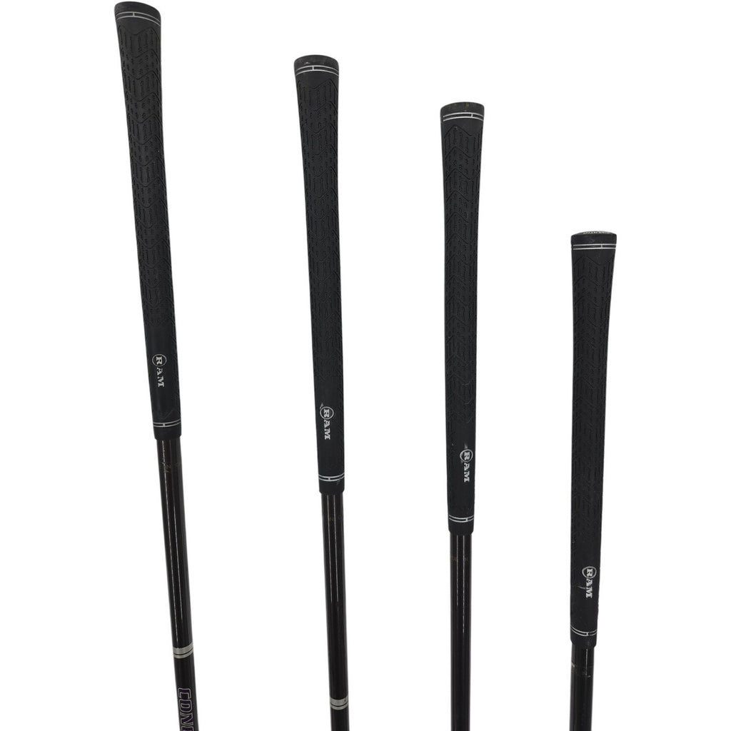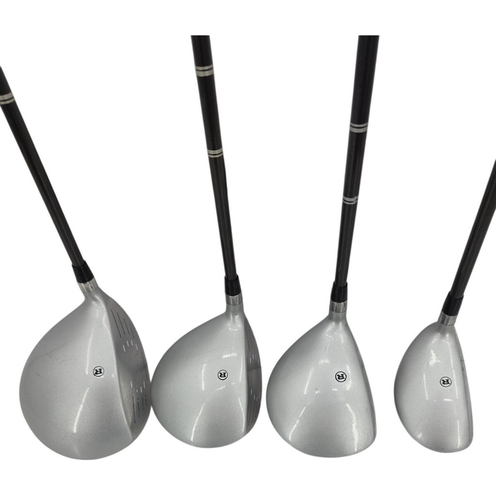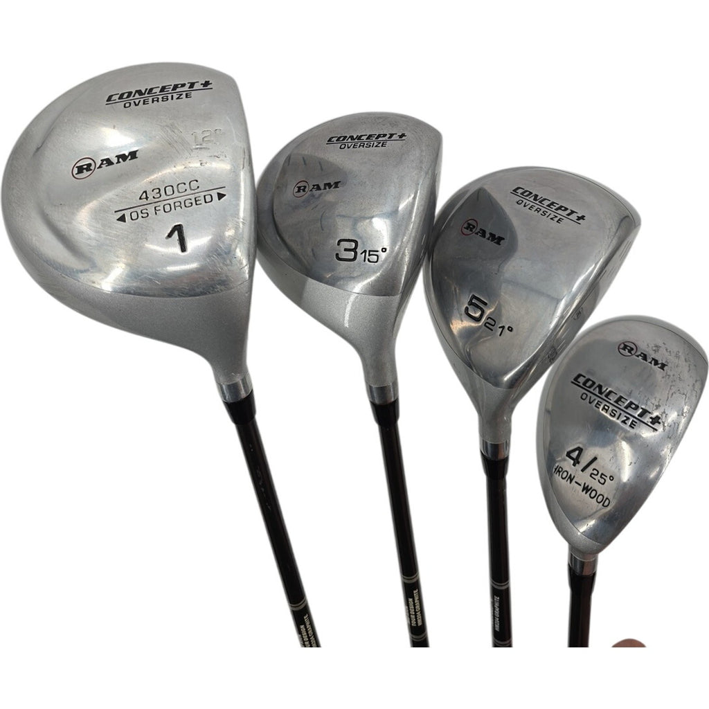 The RAM Concept+ Oversize Metal Wood Golf Club Set includes a driver, 3 fairway woods, and a 4 hybrid club, all with graphite shafts for lightweight performance. With a 3.5° torque and high kickpoint, these clubs offer mid launch and spin for consistent, long shots on the golf course. The sleek black and silver color scheme reflects the modern design of the set, making it a stylish addition to any golfer's equipment collection. Perfect for right-handed male players looking for quality and performance in their golf clubs.