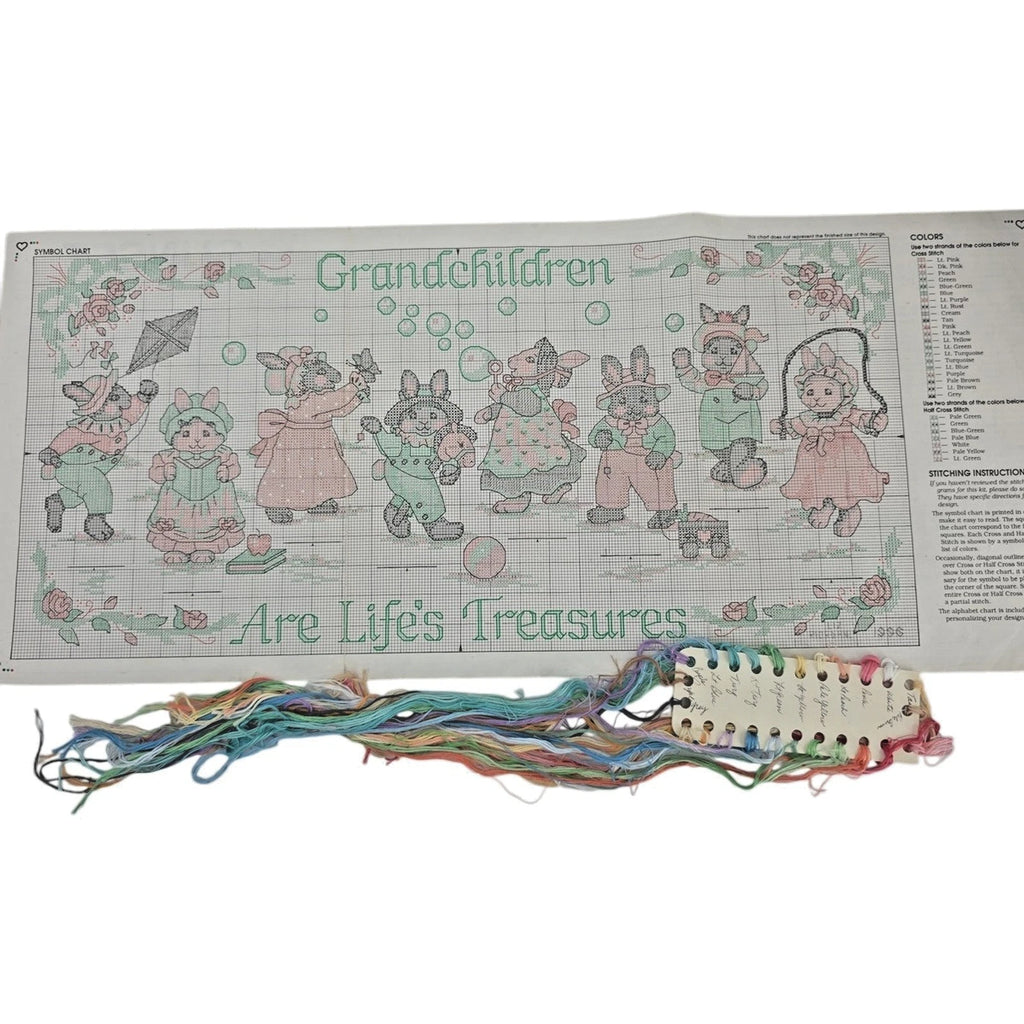The Sunset Counted Cross Stitch Kit from 1992 features a vintage design that celebrates grandchildren as life's treasures. This framed picture kit includes all the necessary materials such as fabric, thread, and a needle, along with a pattern for easy stitching. Made in the United States by the brand SUNSET, this sampler style kit is a perfect project for cross stitch enthusiasts looking to create a heartfelt and timeless piece of art.