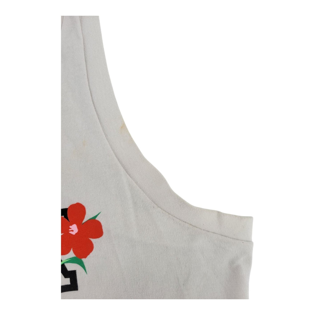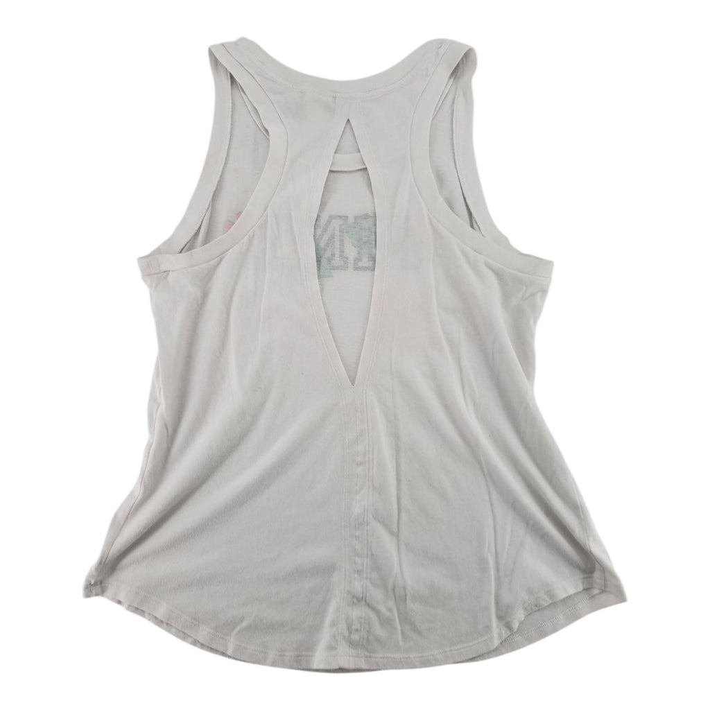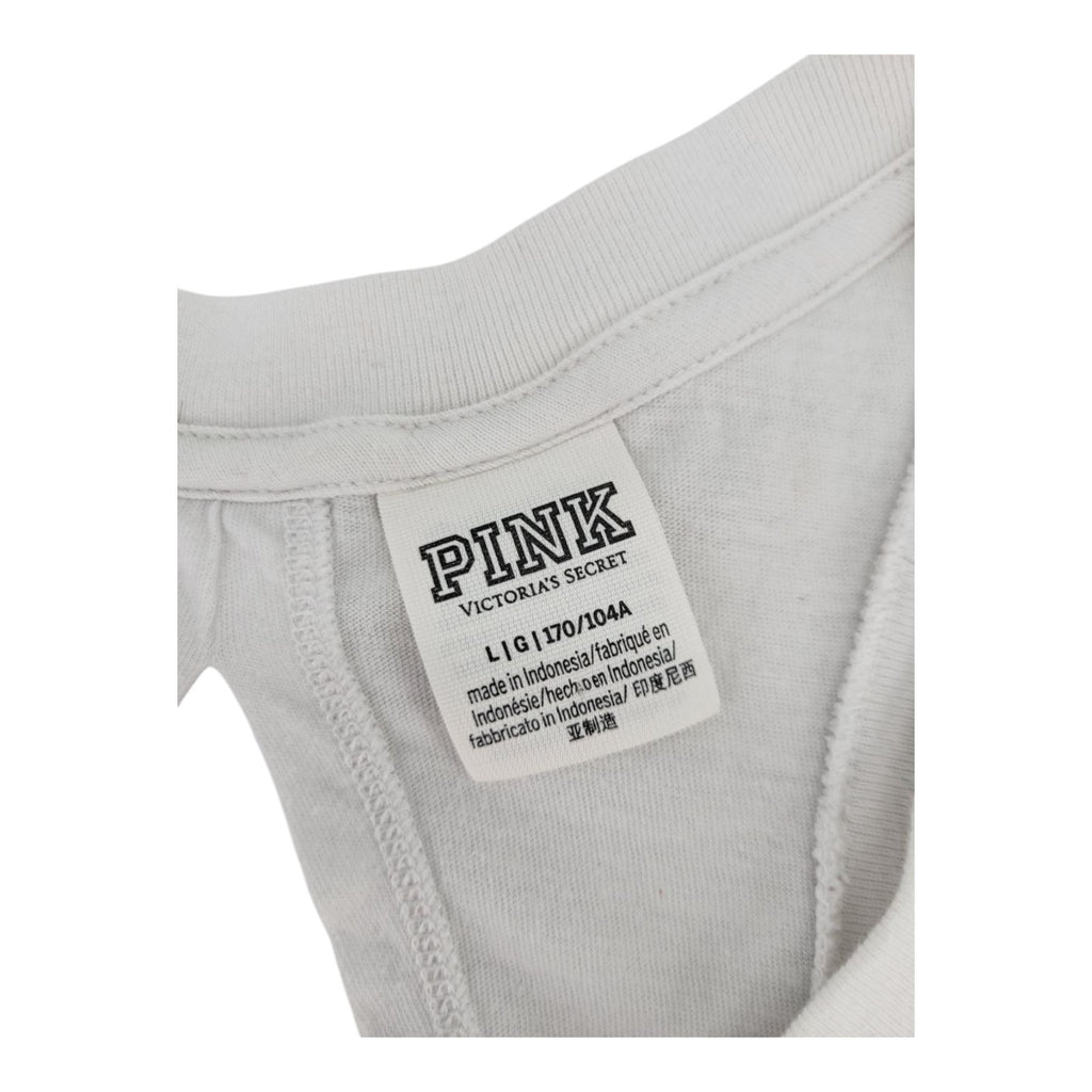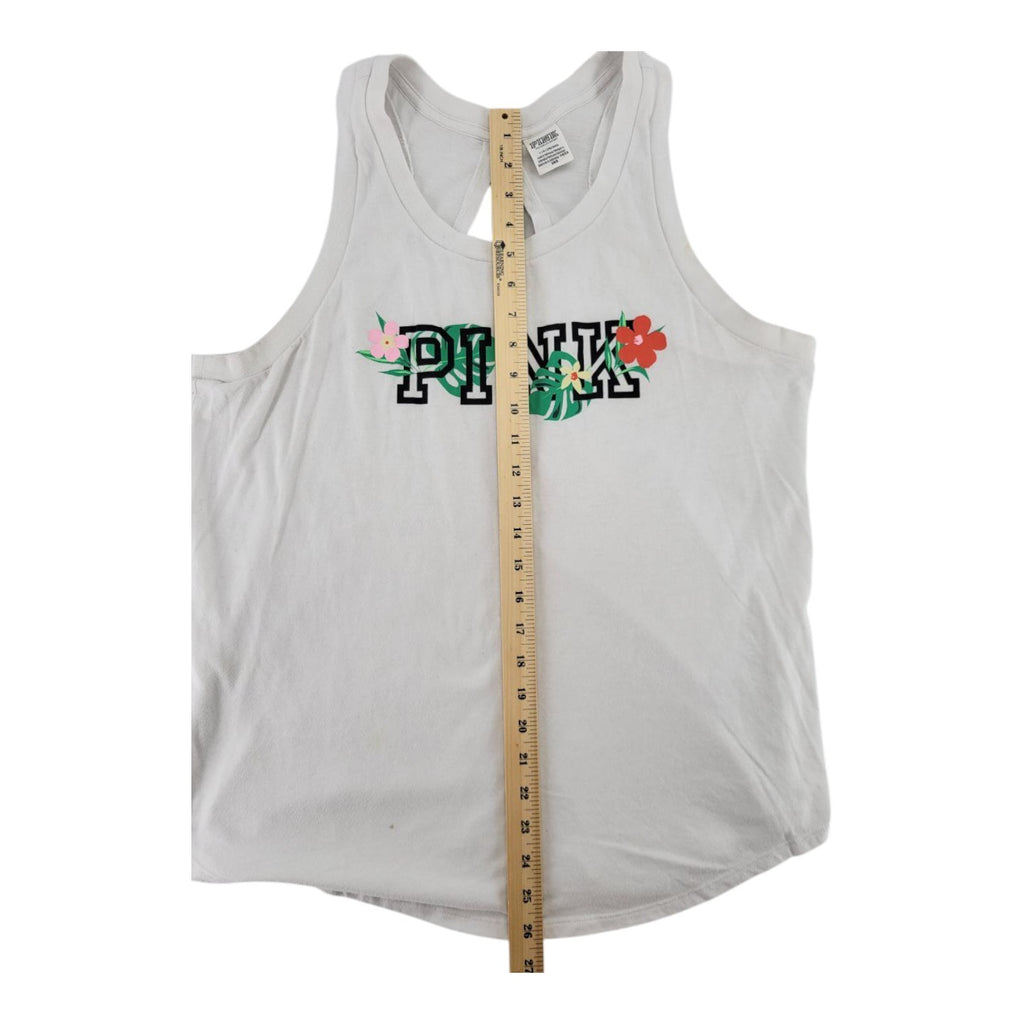 The Victoria's Secret PINK Tropical Logo Racerback Tank Top in white is a stylish and comfortable option for women. This sleeveless tank features a round neckline, pullover closure, and relaxed fit. Made from a cotton blend material, it is machine washable and perfect for casual or travel occasions. The tank top is adorned with a solid floral pattern, making it a great choice for a beach or tropical-themed outfit during the summer and spring seasons. With its lightweight and breathable design, this tank top offers both style and comfort for everyday wear.