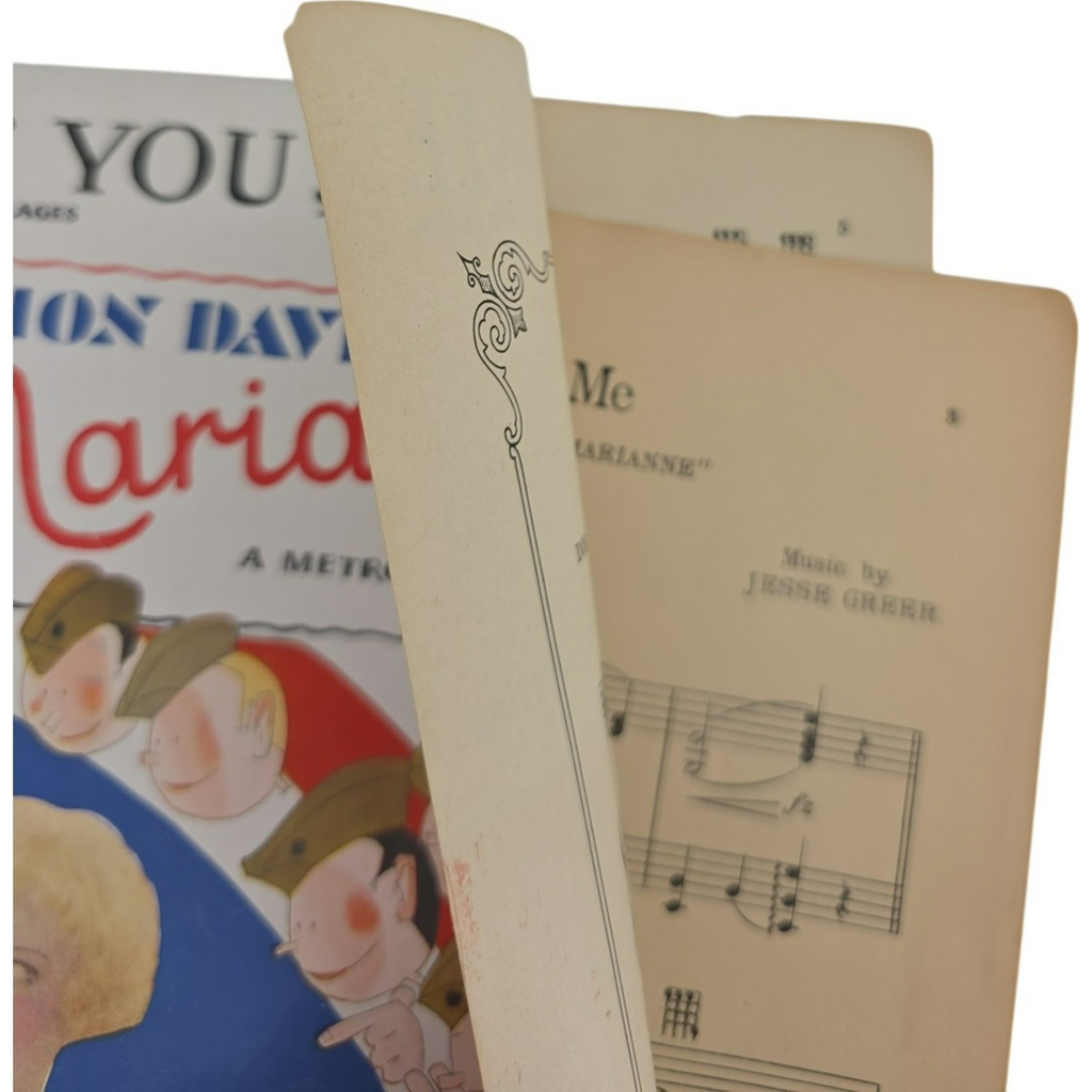 The product is a vintage 1929 sheet music titled "Just You, Just Me" from the movie "Marrianne" starring Marion Davies. This sheet music is aimed at intermediate level piano players and belongs to the genres of musicals and soundtracks. Published by Robbins Music Corporation in the United States, this unit contains one sheet of music in its original format, perfect for collectors or enthusiasts of vintage sheet music.