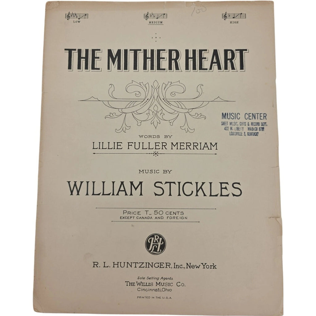 This product is a vintage 1930s sheet music for the song "The Mither Heart" by William Stickles. The sheet music is in piano format and is ideal for intermediate level musicians. Published by R L Huntzinger in the United States, this piece falls under the genre of Musicals and is suitable for orchestral ensembles. Perfect for collectors of vintage sheet music or musicians looking to add a unique piece to their repertoire from the 1930s.