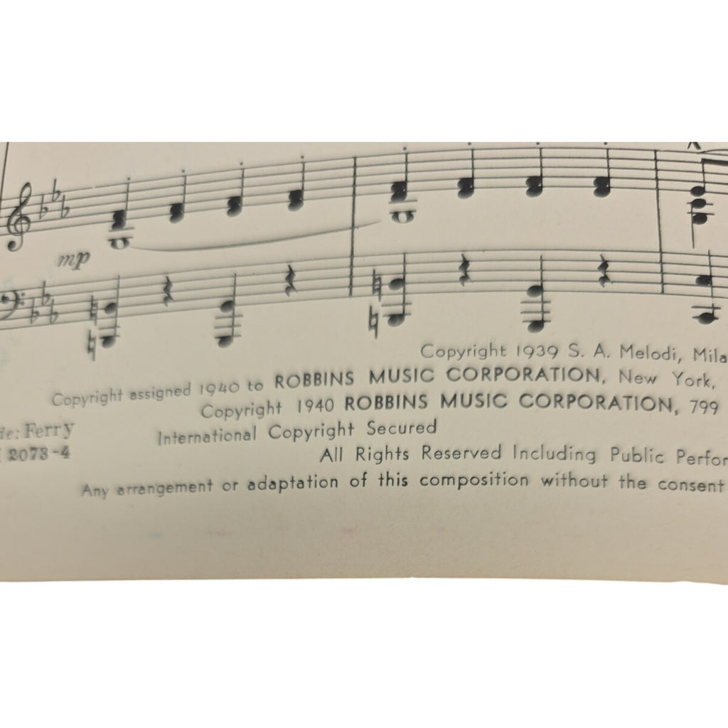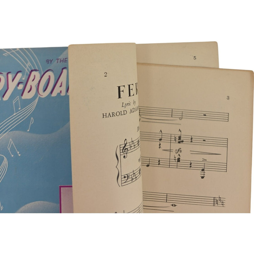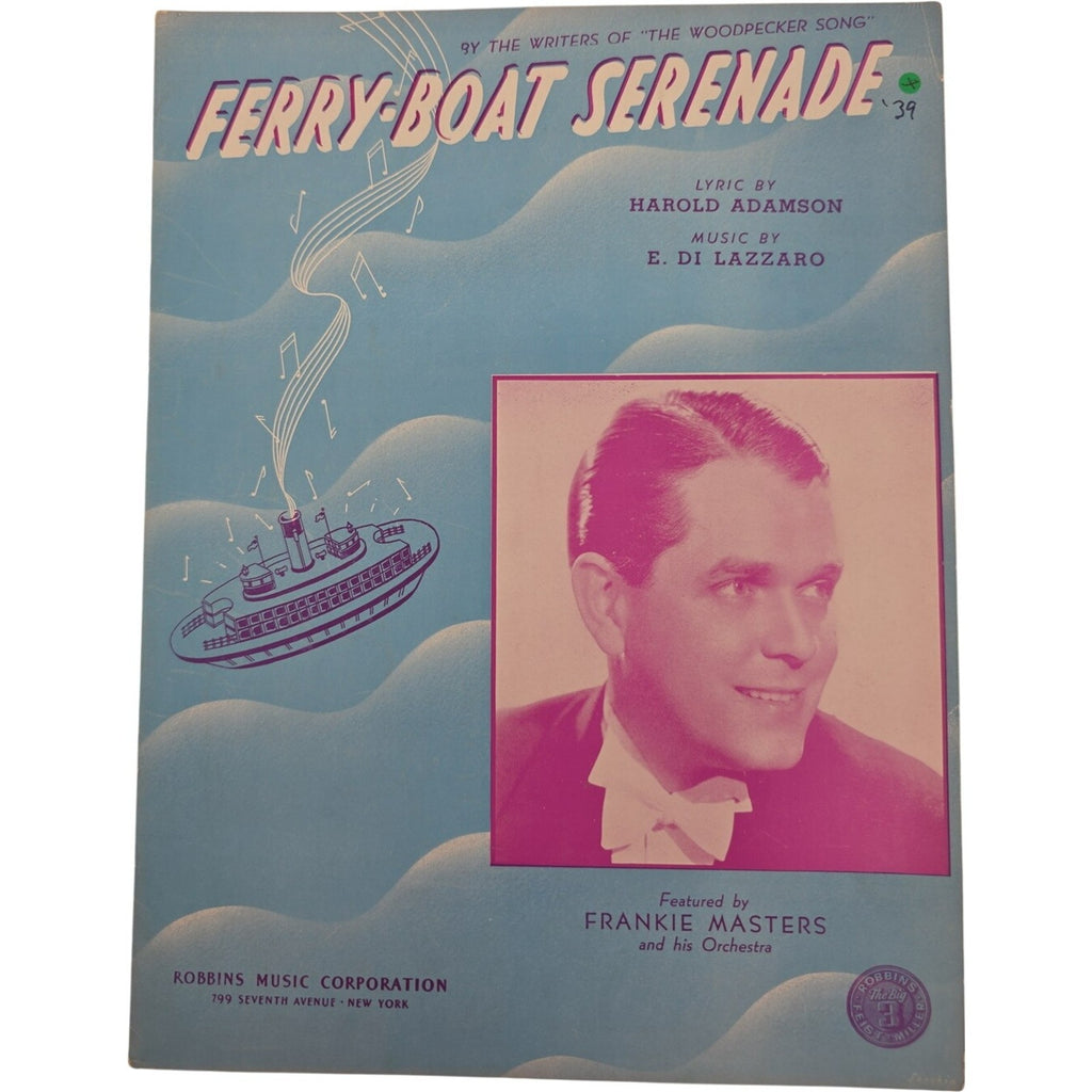 The product is a vintage 1940 sheet music titled "Ferry Boat Serenade" by Frankie Masters and E Di Lazzaro. It is designed for piano and falls under the genre of Musicals. Published by Robbins Music Corp. in the United States, this sheet music is a unique and collectible item for music enthusiasts. Perfect for those who appreciate classic musical scores and vintage music memorabilia.